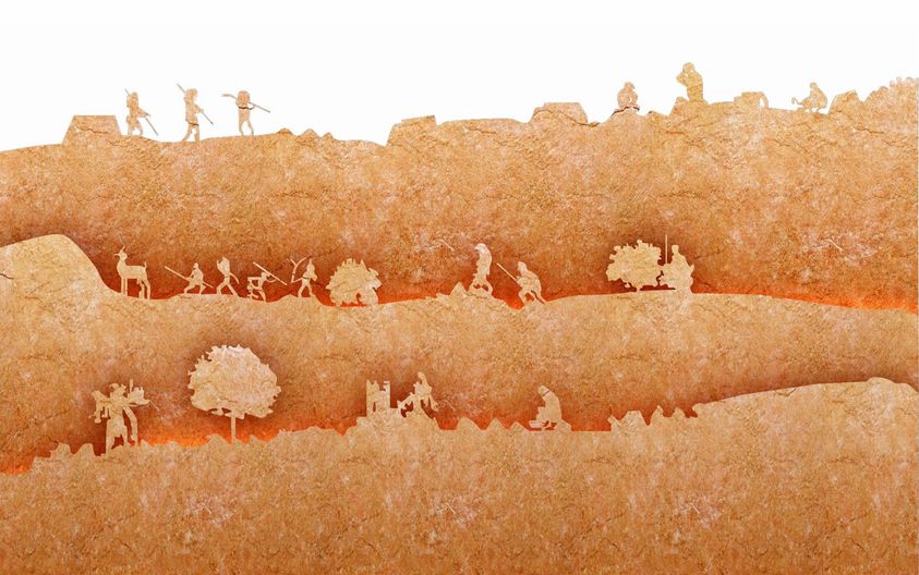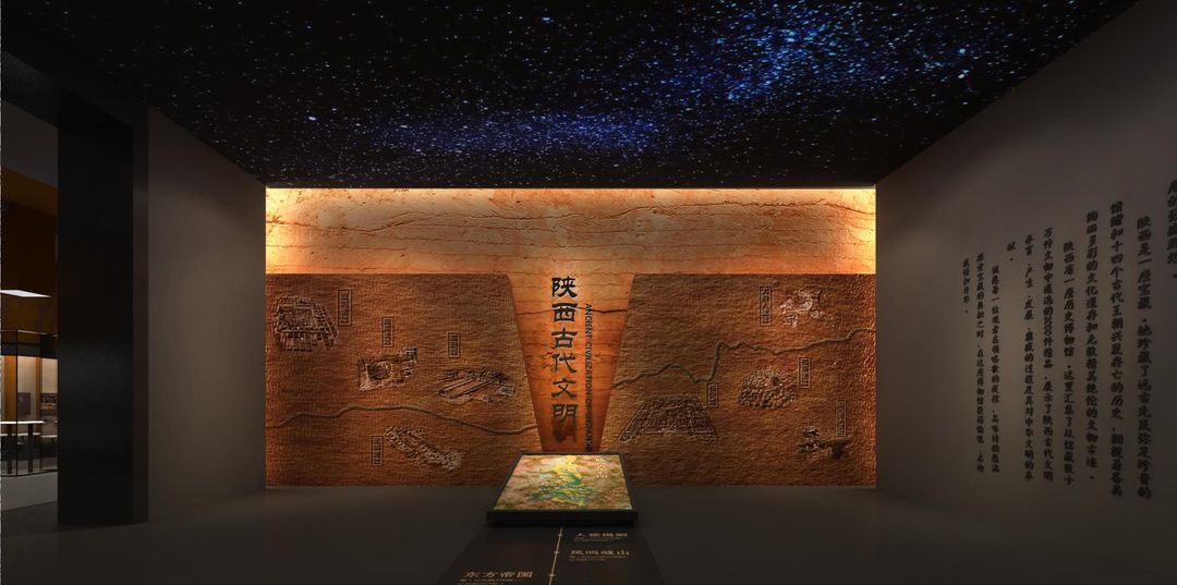 陕西古代文明前言厅,浮雕墙背景为厚重的历史土层,墙面上千年遗址分列,灿若星辰,荟萃于陕西省地形沙盘,陕西历史博物馆古代文明史的大幕自此开启。