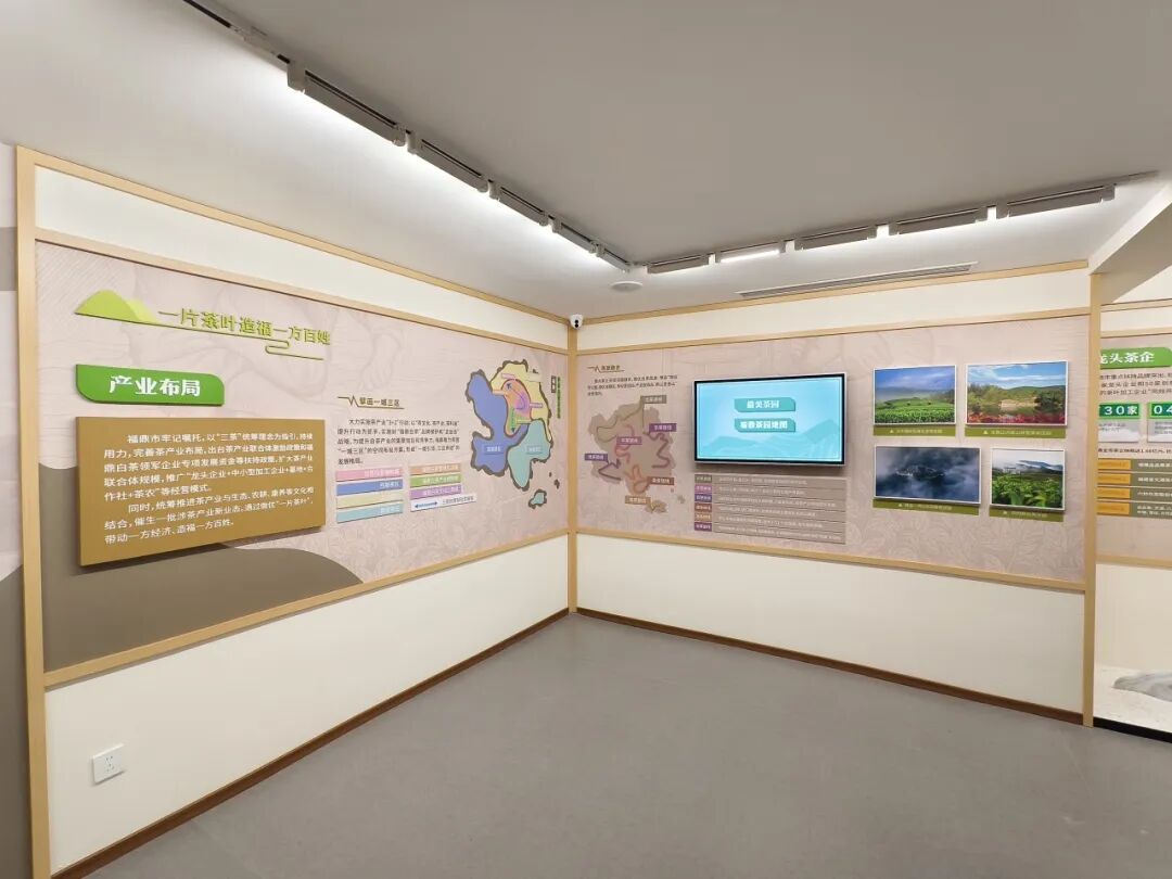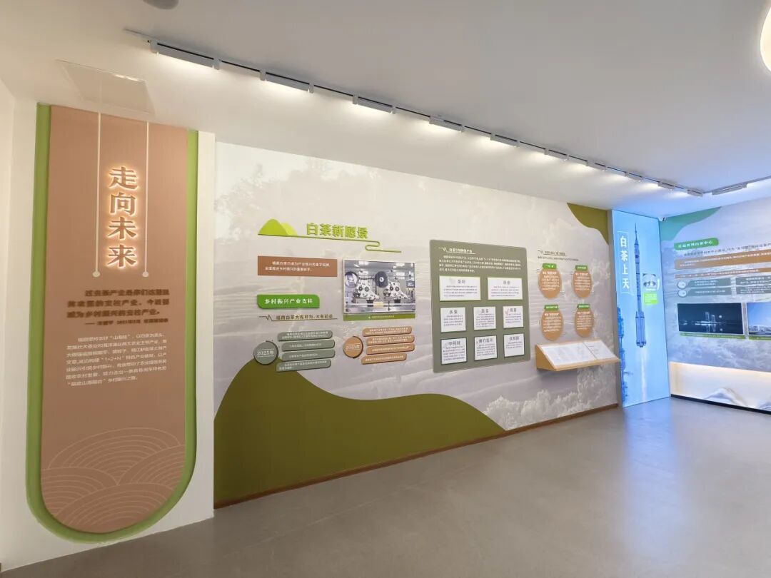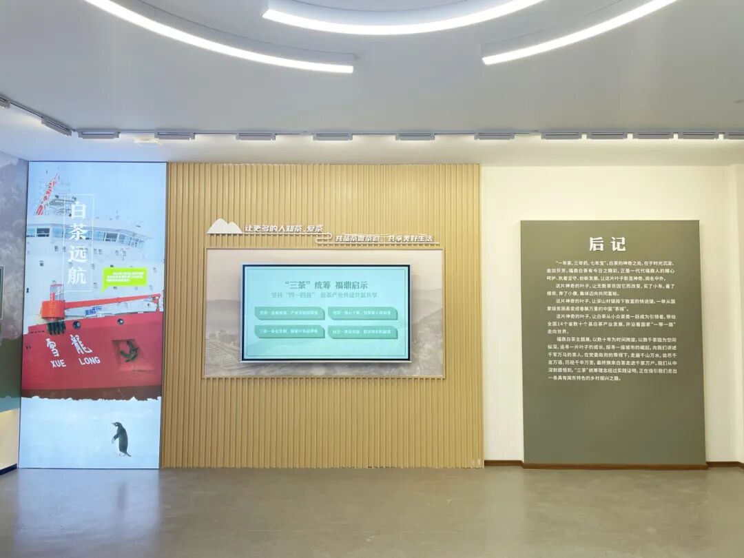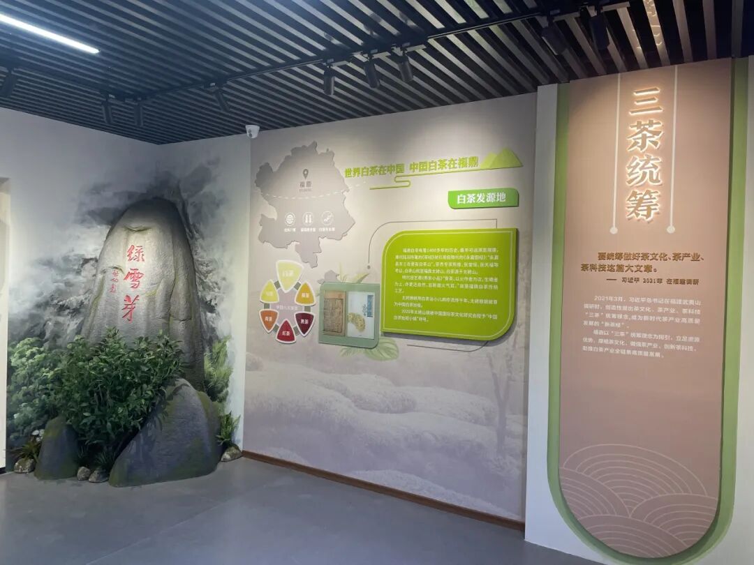 展厅分为“山上银行”、“三茶统筹”、“走向未来”三个篇章,讲述福鼎白茶的起源与发展,展示“三茶”统筹的生动实践。
