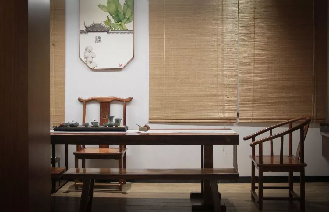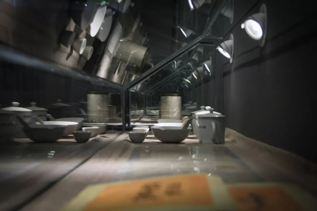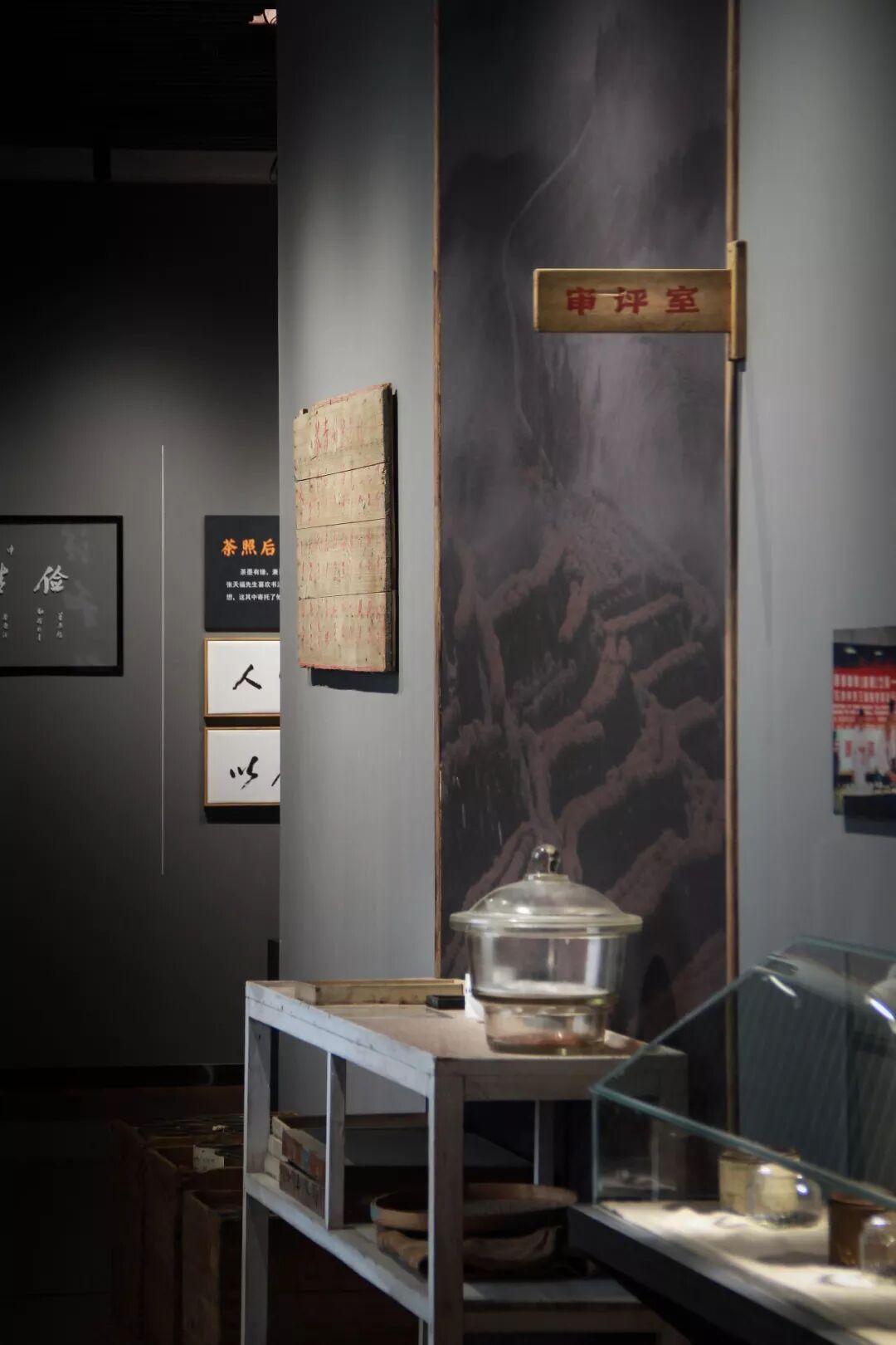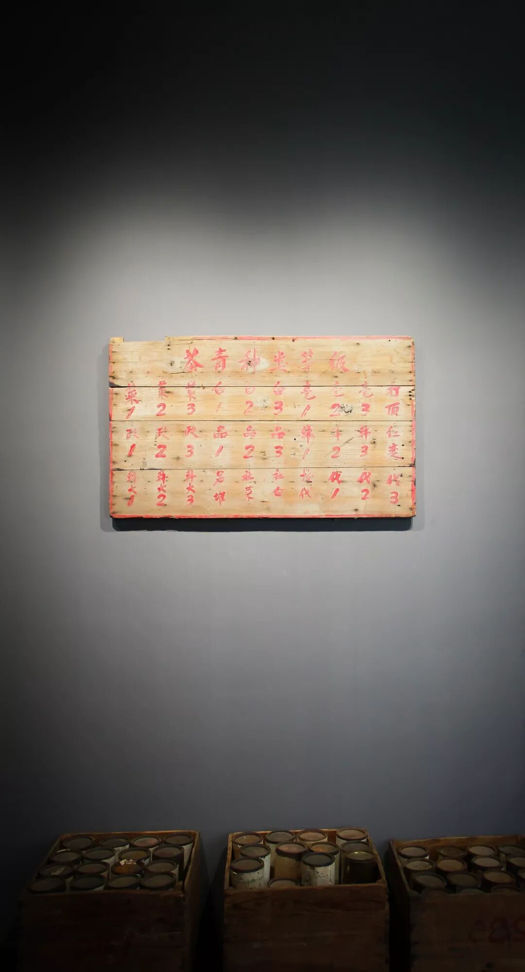 一组审评室的场景还原,带我们回到那个年代。光透过玻璃照进展馆,斑驳的竹影印在墙上,审评台上的器具印出光影,桌子旁摆放着几箱茶样,墙上的挂板,张老书写的字样历历在目。