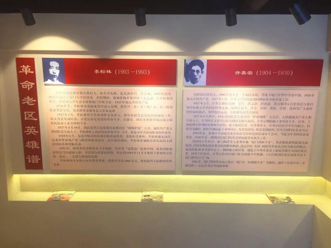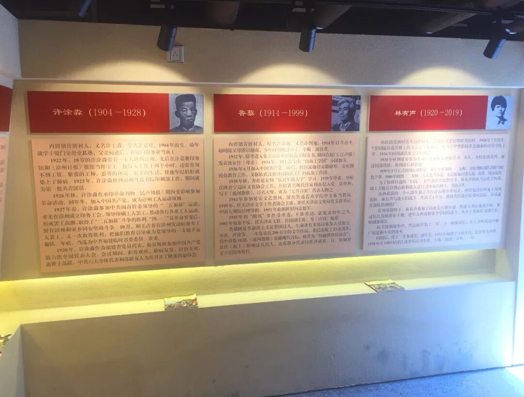 隔墙另一侧的展板上,展示的是第四部分“革命老区英雄谱”,分别讲述兴泉永政治监察署指导员、早期闽南地区党组织重要领导人李松林;中共六大代表、漳州工人运动领袖许涂淼;同安县委委员、革命烈士许英宗;奔赴延安的著名诗人鲁藜和开国大校林有声等五位内厝革命代表人物事迹。
