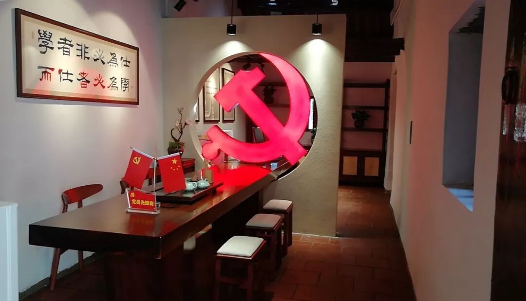 走进由葡萄架围着的室外讨论区,这里配有石凳石桌等,学员可以在此边进行室外的思想交流与学习探讨。右侧是一面庄严的宣誓墙,供来党校培训的党员干部进行入党宣誓与重温入党誓词等活动。