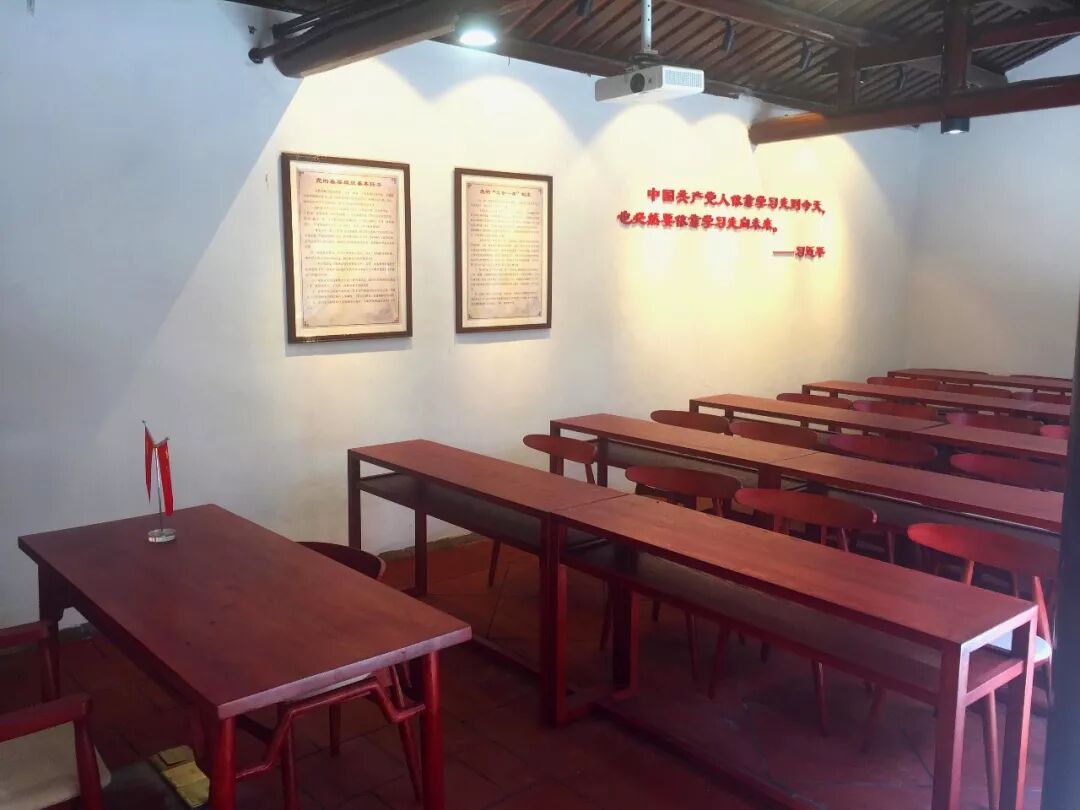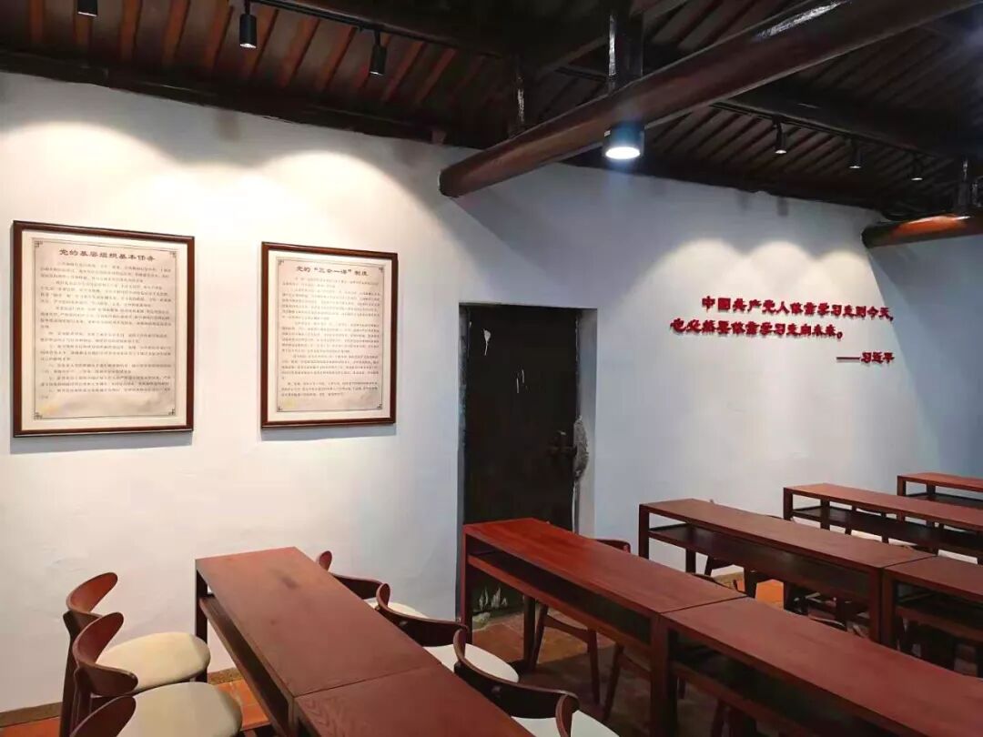 讲台后有党旗和入党誓词,供党校学员举行入党宣誓仪式、重温入党誓词活动等。墙面上挂有《党员的义务》《党员的权利》《党的基层组织基本任务》《党的“三会一课”内容和制度》等,以及习近平总书记关于学习的论述:“中国共产党人依靠学习走到今天,也必然要依靠学习走向未来。”