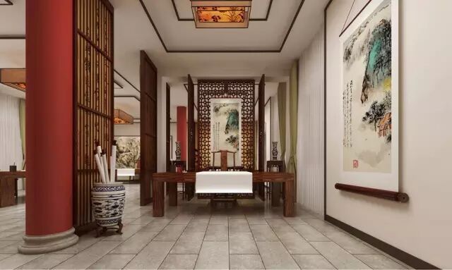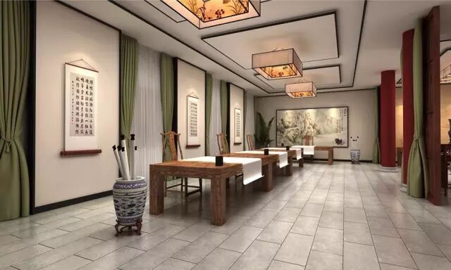 翰墨堂二楼设计为书画活动区。整体风格以清逸俊雅为主,镂空隔断与草绿色窗帘暗喻松竹之姿。