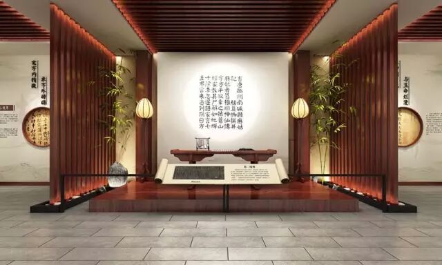 鲁公阁的整体风格依然延续清逸俊雅的设计思路,将展柜融入设计,采用多种材质塑造富有变化的空间层次,突显颜真卿刚正不阿、深竭忠贞、克著名节的品质。