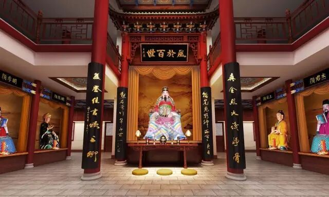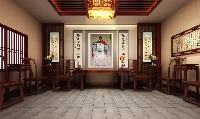 采用古建构建和布幔的形式来丰富空间层次,营造庄重的祭祀空间。整体采用红、黄等明亮的色彩,营造家庙的氛围。