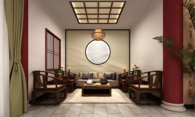 原建筑格局中,半开放的茶室空间有限,设计师巧妙运用一半通透的圆形窗户借远处山景入室,意境深远,打造成一处充满趣味的禅意空间。