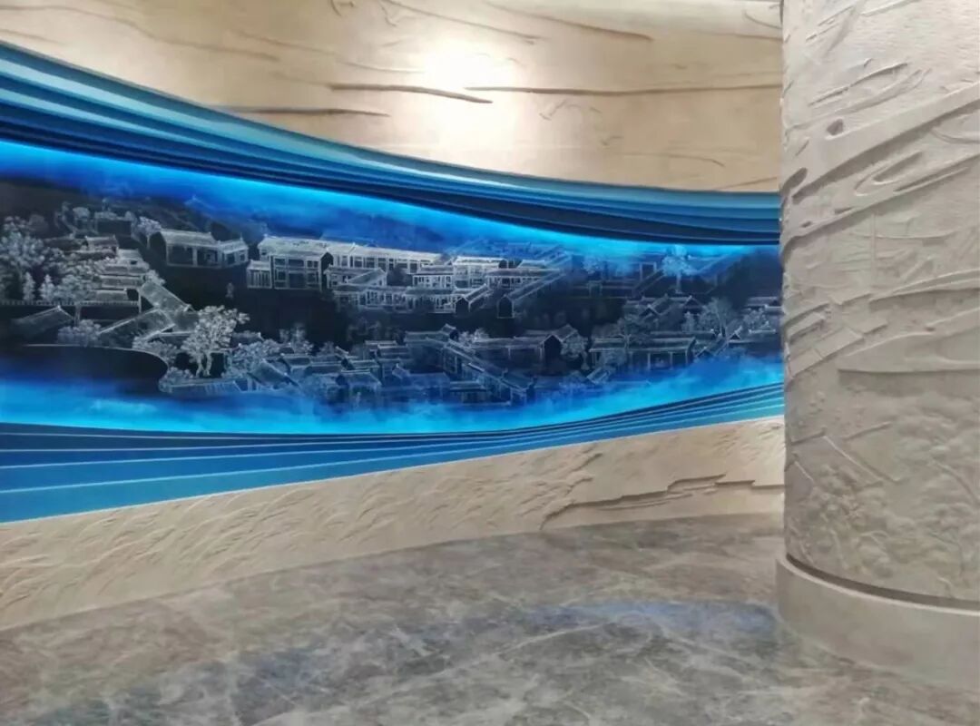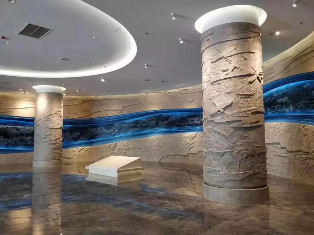 透过序厅蓝色琉璃的河流水面,能看到海安人自古而今依河海而生的精致故事画面,趣意盎然。海纳百川,纵览的是恢弘境界;安居乐业,满载的是家国情怀。