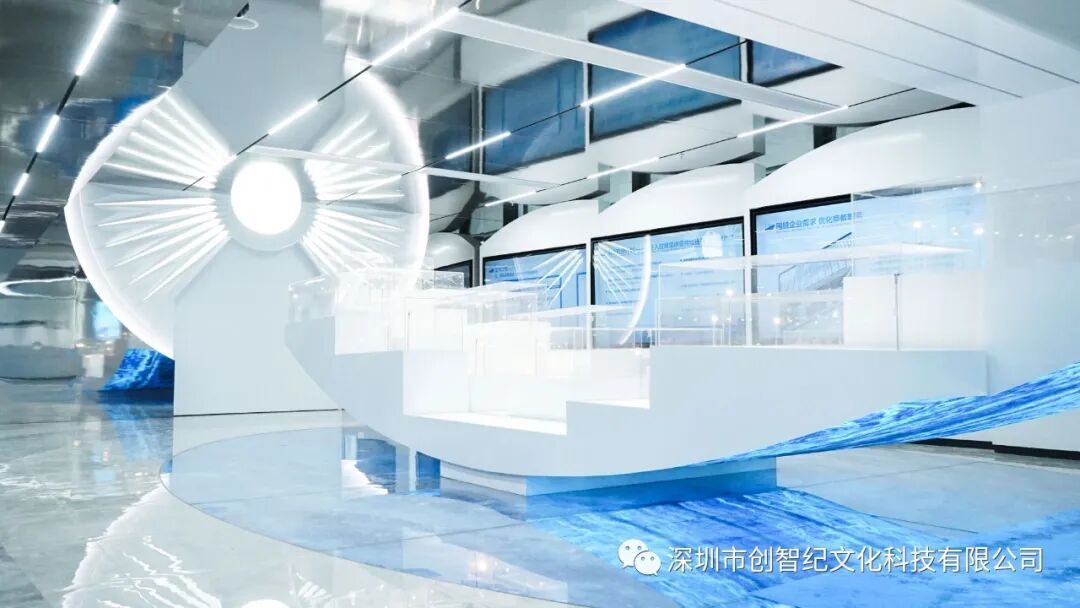 展厅中央帆船艺术展台呼应海浪地面,利用多媒体手段,打造海船起锚,砥砺前行的空间氛围。其后方的感应门造型酷似机械螺旋桨,寓意动力永续,半圆造型配合镜面反射形成一个完整的圆形,寓意合作共赢。船上设立的多个展柜可以为入驻企业提供展品展示的平台。
