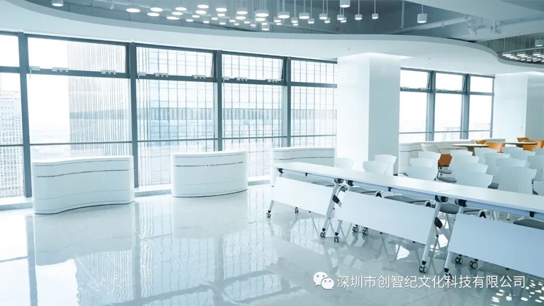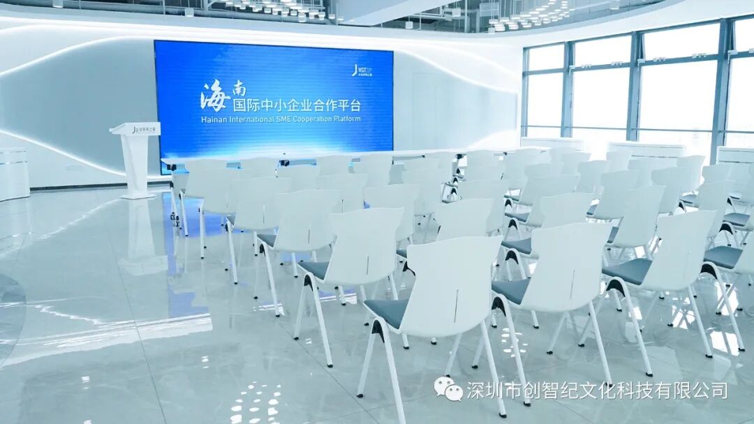 墙面两侧的100寸一体机可以根据实际情况为大厦商户提供多媒体展示,其中靠窗侧的几何船帆造型,通过有序排列,形成帆樯林立、舳舻相接之势。