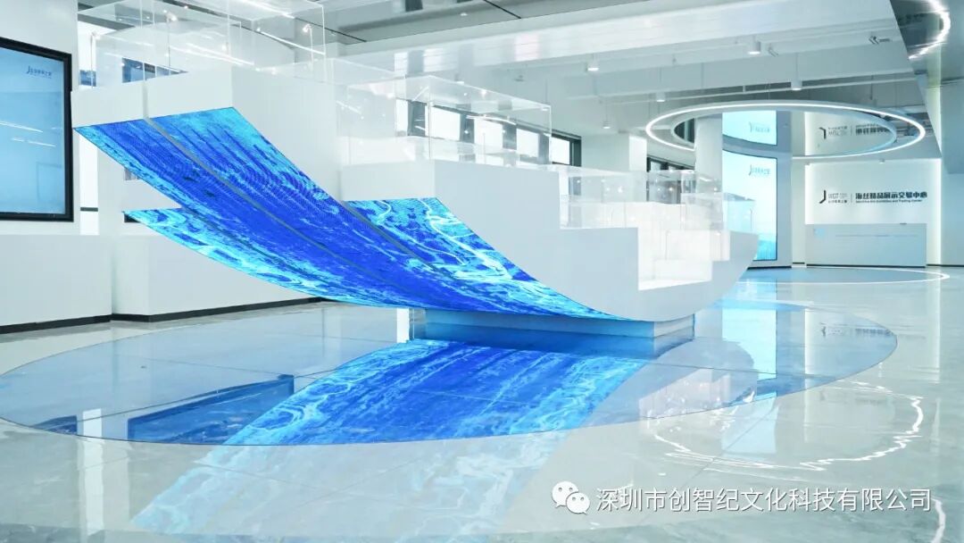 展馆提取拥抱深蓝、向海图强的地域特色,结合海南自贸港开放包容的自由贸易优势,以灵动的手法打造沉浸式空间,成为自贸港的网红打卡点。