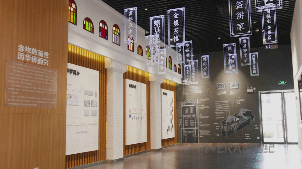 设计还原赤坎商埠空间,骑楼底部“五脚基”街道样式、上方半拱天窗、“老字号”招牌艺术装置,观众仿佛置身百年商埠,神游赤坎因商而兴的繁盛过往。