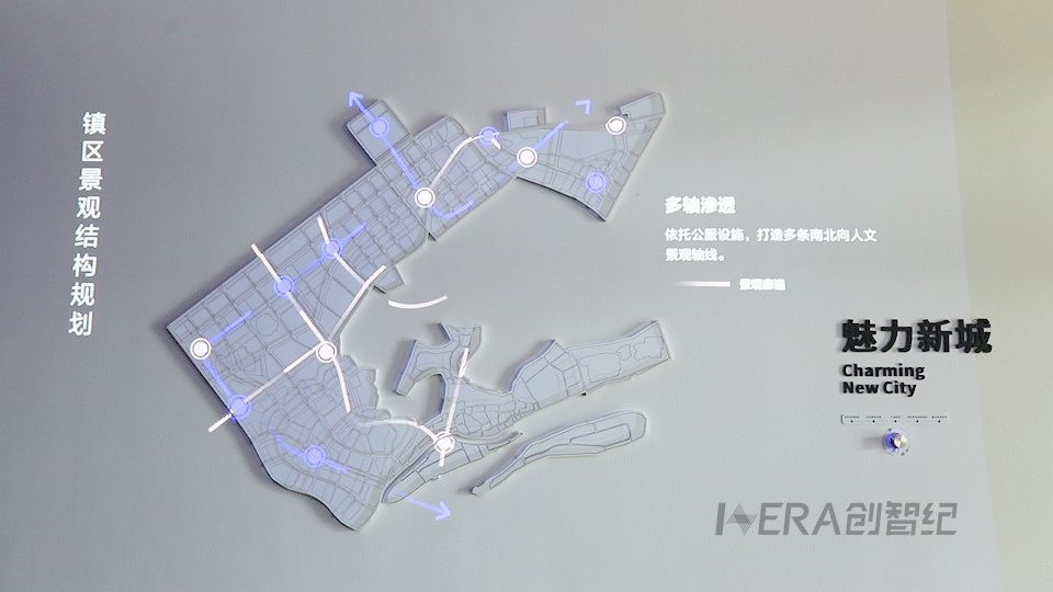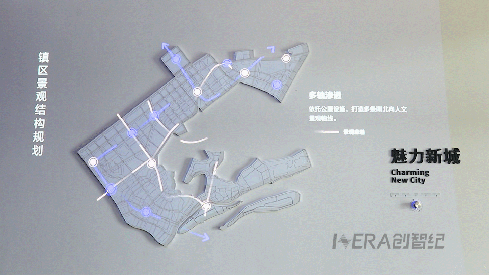极简化展墙风格设计、立体化数字壁挂模型、科技化光影画面,从多层次多角度展现赤坎新区“一心两轴三节点四组团”空间规划理念,再造一个百年后的古镇。