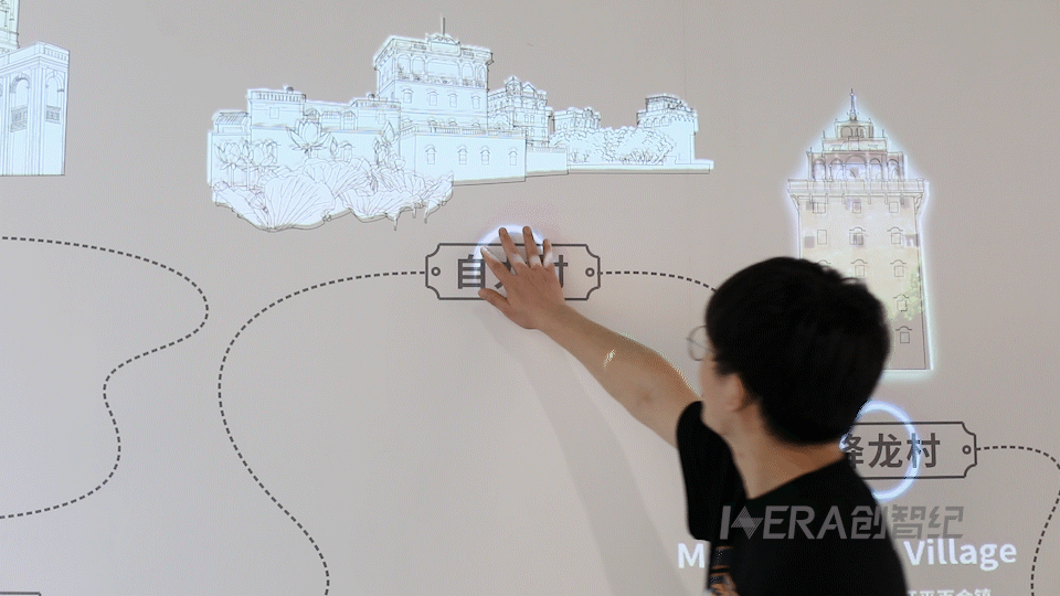 一图看赤坎,新颖设计漫画式图文展墙,观者伸手感应展墙,触发光影画面,一个个生动的赤坎故事浮现人们眼前,让观者在互动娱乐中感受赤坎魅力,体验赤坎人文风情。