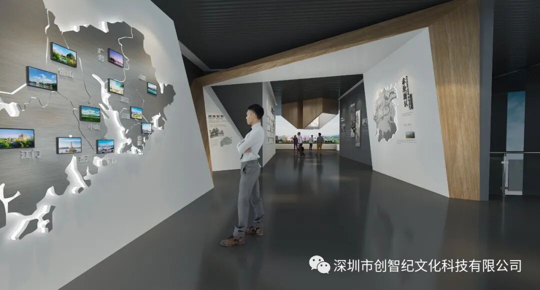 展示中心地面建筑共有三层,创智纪设计团队将空间分为赤坎记忆、赤坎未来、招商项目三个展区,并融合了数字沙盘、幻影成像、全息投影、大数据人机交互等多种高新科技,从古至今将赤坎古镇新区的发展历程和百年侨乡的古韵风情融合在了一起。
