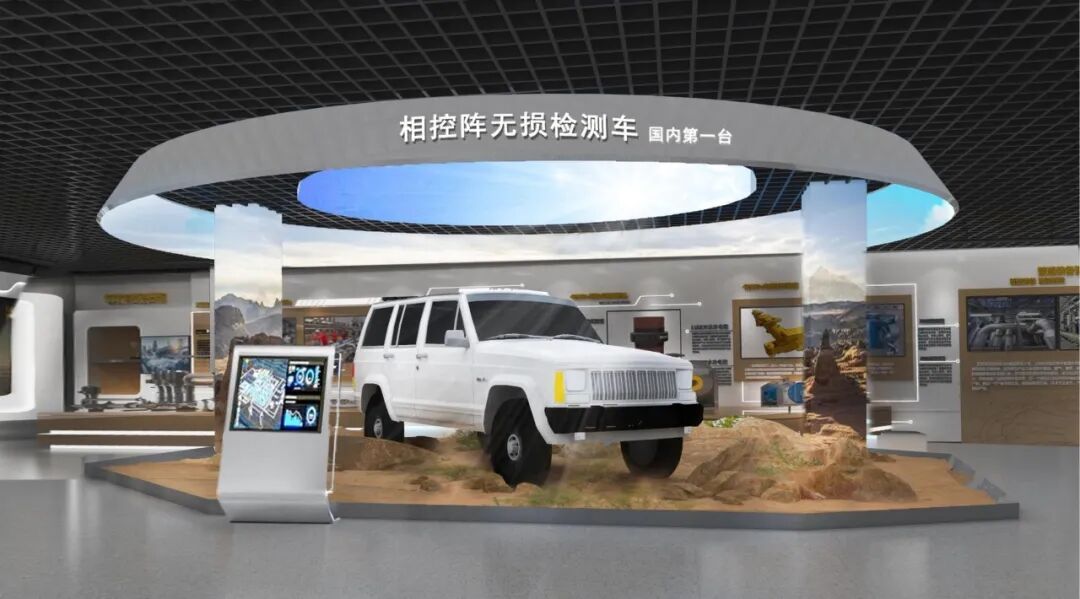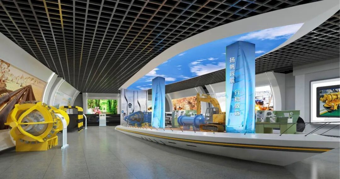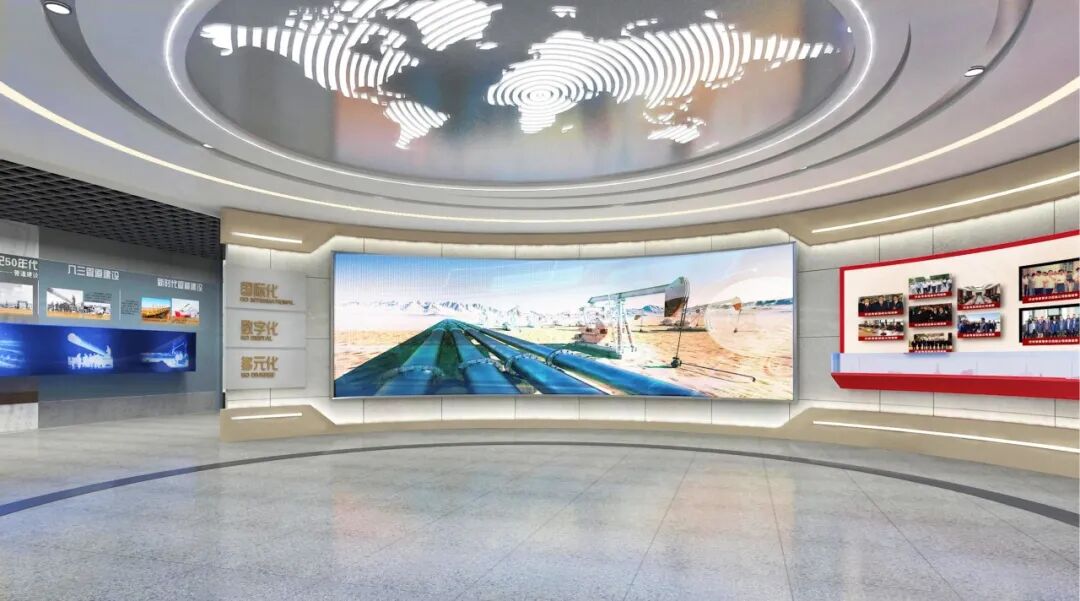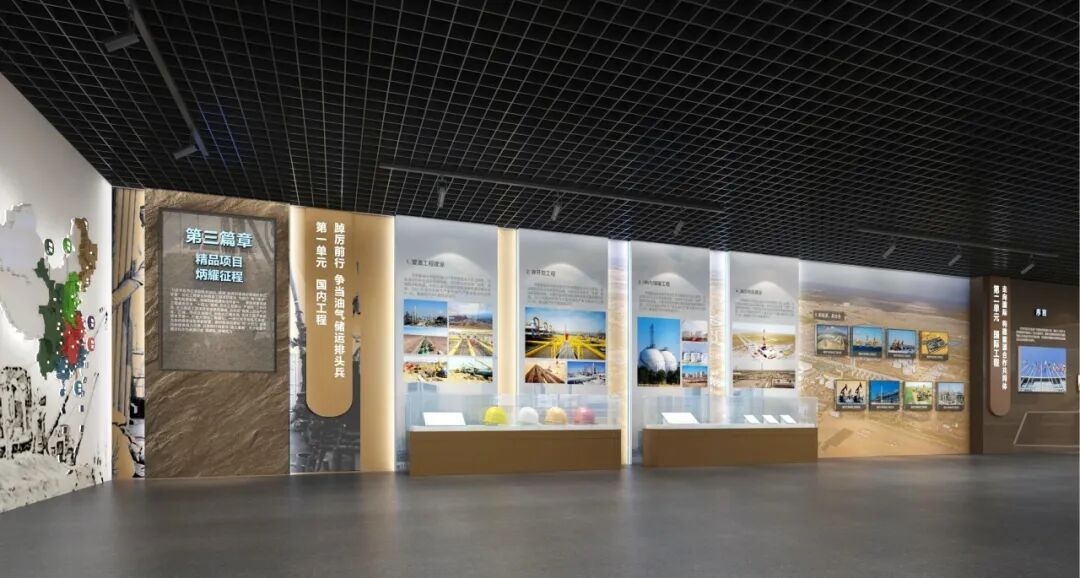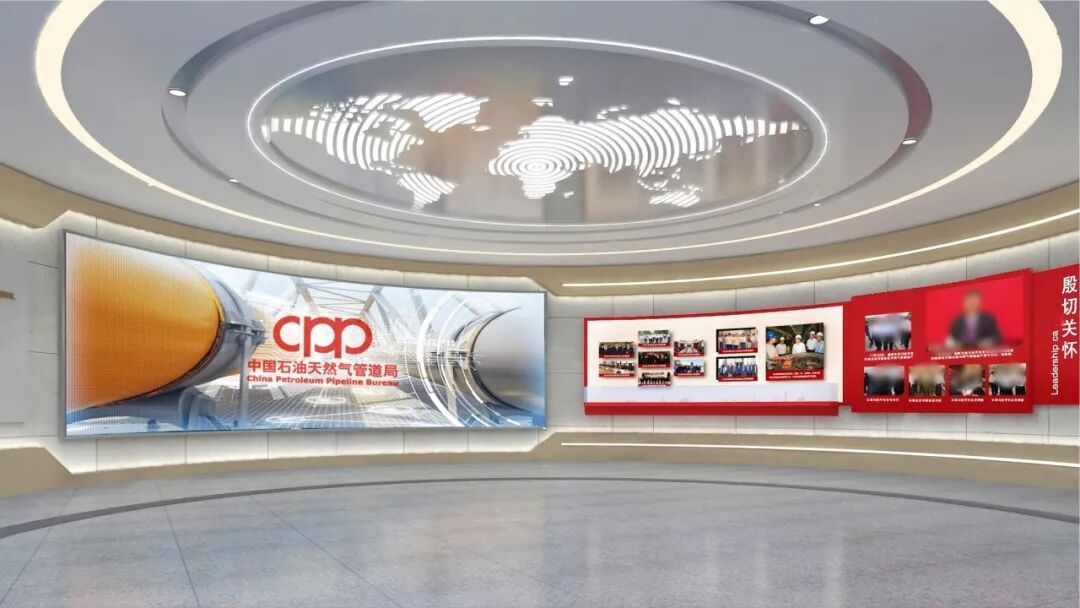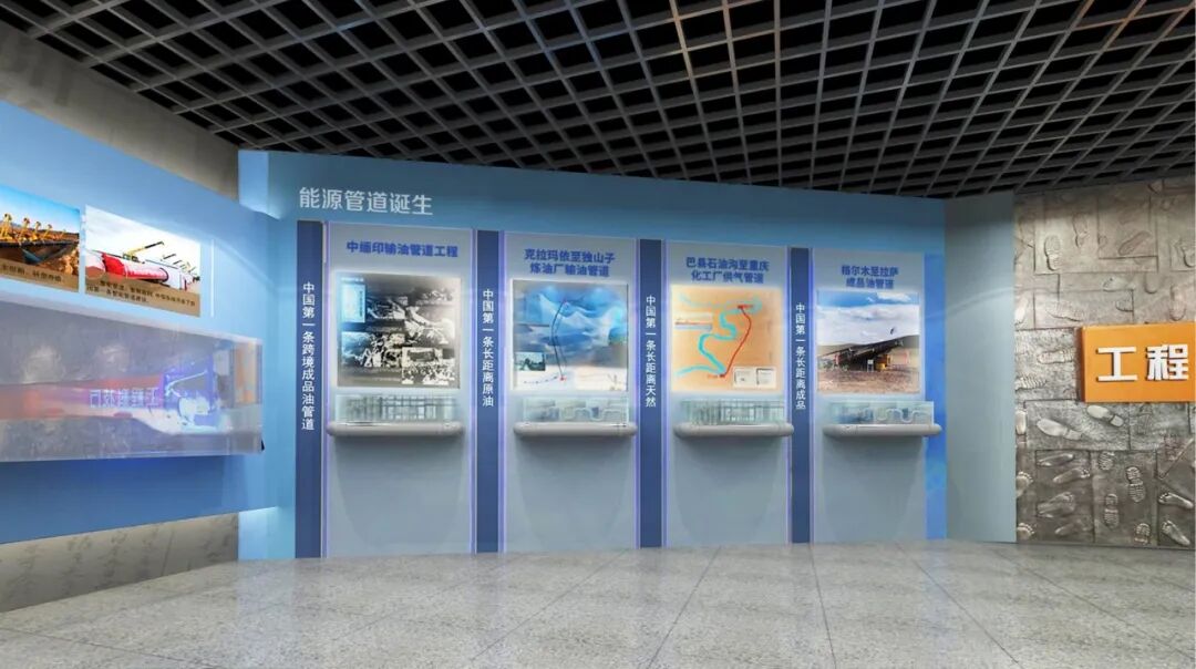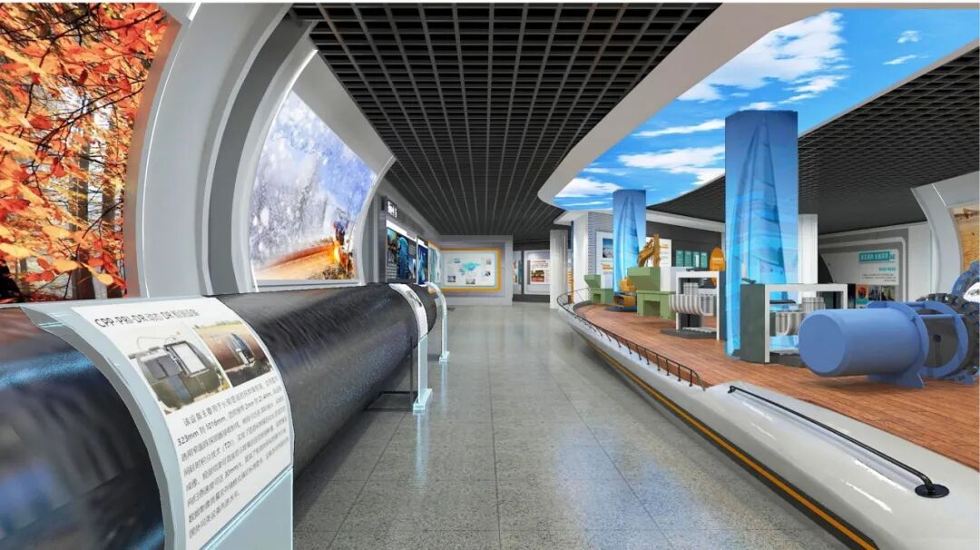 实物管道翻新装饰,管道剖面结构的展墙造型更加呼应主题,透明发光展板增加科技感。展陈画面结合氛围投影灯展示管道人一年四季在恶劣环境下艰苦奋斗的工作场景,传递着“管道为业、四海为家、艰苦为荣、野战为乐”的企业精神。乘风破浪创意场景展示焊接工艺及管道通用机械设备,巍巍巨轮造型展台与顶部蓝天白云相互呼应,寓意管道事业扬帆远航,行稳致远。
