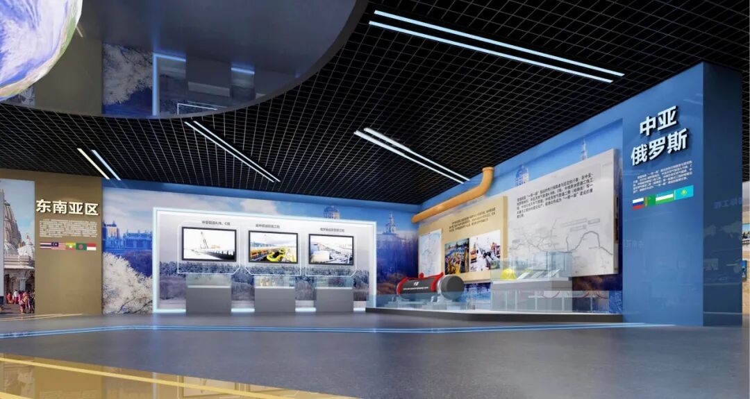 中亚-俄罗斯展区以蓝色为主基调,结合重点工程,突出管道局是一带一路的先行探路者和坚定执行者。