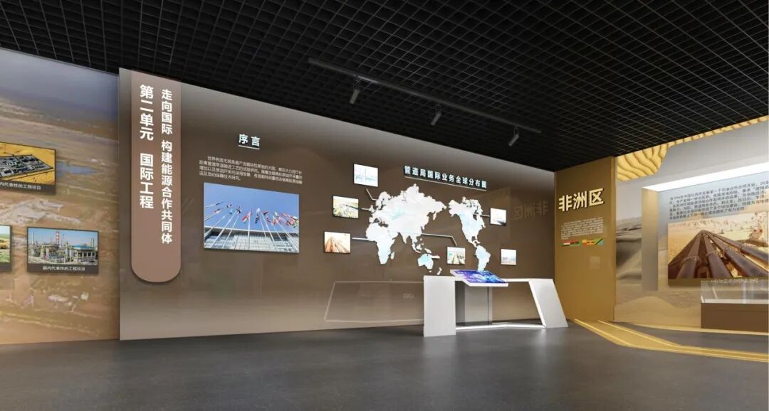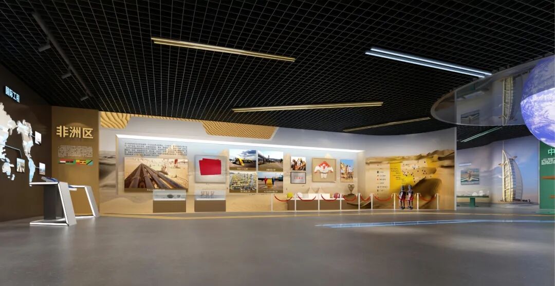 非洲区域以沙漠为元素,保留原有实物展示,展墙展示相关工程案例。