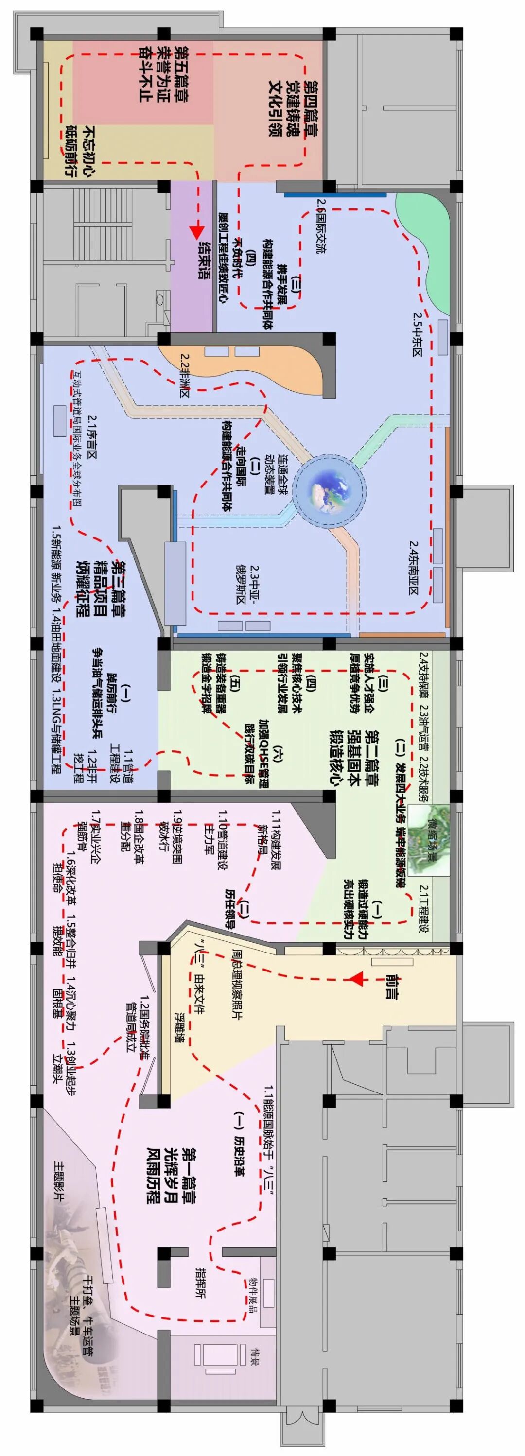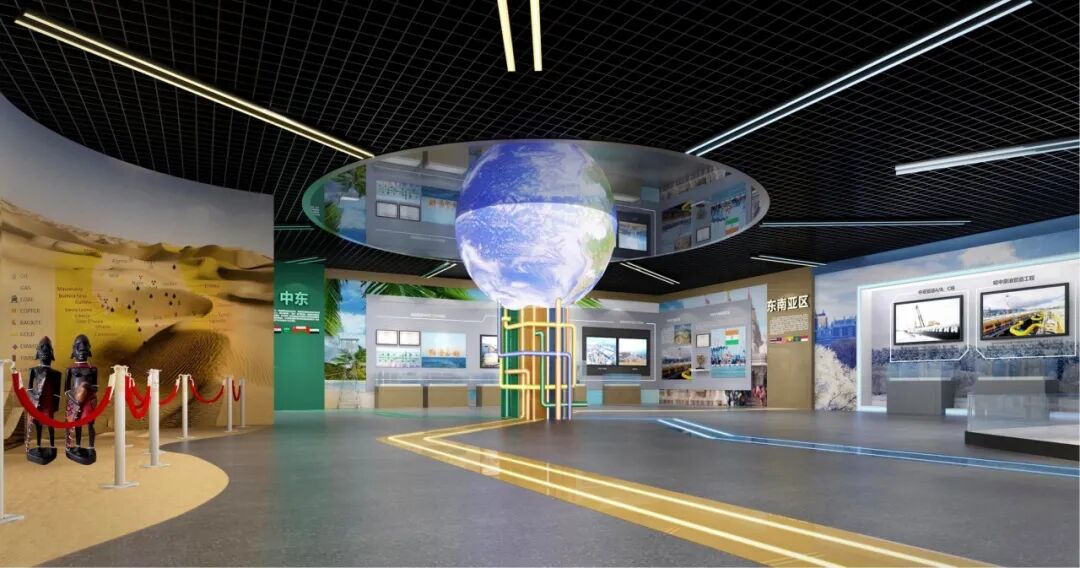 本层我们将指挥部场景与牛车运管场景重新布局,保证空间开阔的同时提升场景张力。国际工程展区是重点打造区域,拆除部分展墙,顶地统筹考虑,以“全球视野、开放合作”为设计理念,结合空间内部柱子打造环形中岛布局,空间格局开阔,观展更为舒适。