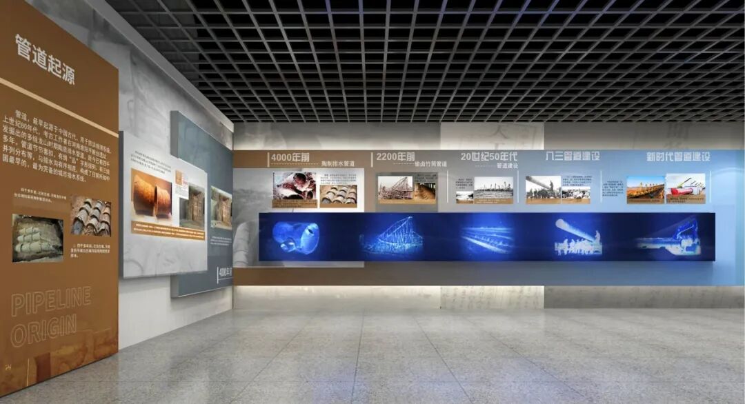 管道的起源采用超长幻影成像结合图文,展示管道由陶制管道至现代管道更新迭代的模型场景,亦真亦幻的场景,娓娓道来的故事,引领观众进入管道的世界。