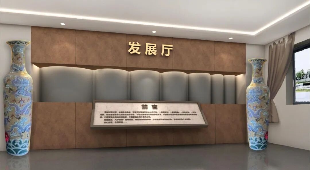 进入引厅,顶地以及序言保留,主题形象墙更换展墙材质,突出管道局的历史厚重感。