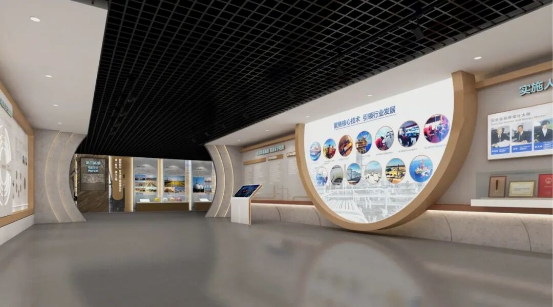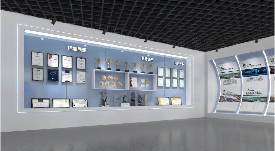 核心技术及荣誉展区简洁庄重的设计风格衬托着核心技术及荣誉,进一步强化参观者对管道局能力的深刻认识。