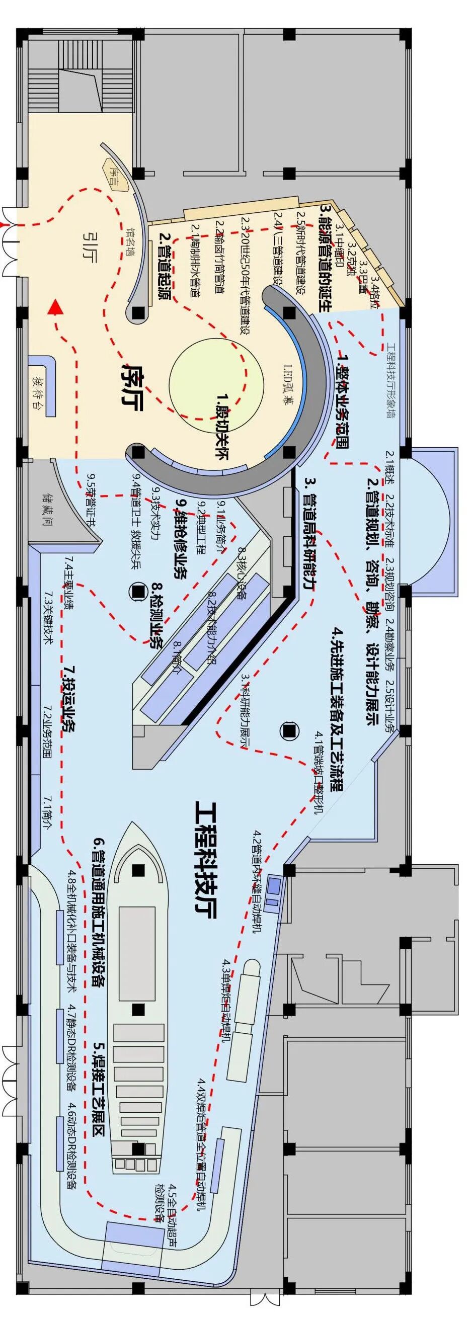 中国管道博物馆建成于2008年,1-3层为展览展示功能,建筑面积共计3390㎡,本次涉及升级改造区域布展面积约3170㎡。由于展馆为综合服务办公楼改造而来,且建成时间较久,整体空间规划及展陈形式较为陈旧,无法满足当下观展需求;另考虑布展面积较大且改造时间紧迫,合理规划,有明确针对性的设计升级是本次改造的重点。