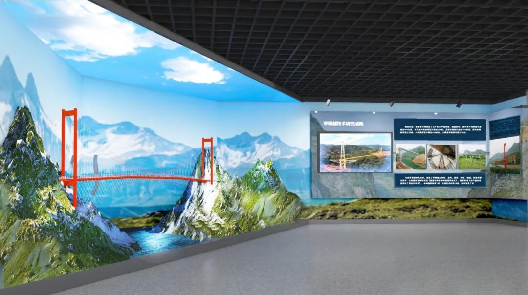 跨越业务展区原时光隧道拆除,空间划分为三部分,分别展示跨越业务、管道监测业务及卫星技术业务。悬索桥位置前移,与跨越业务统一展示。