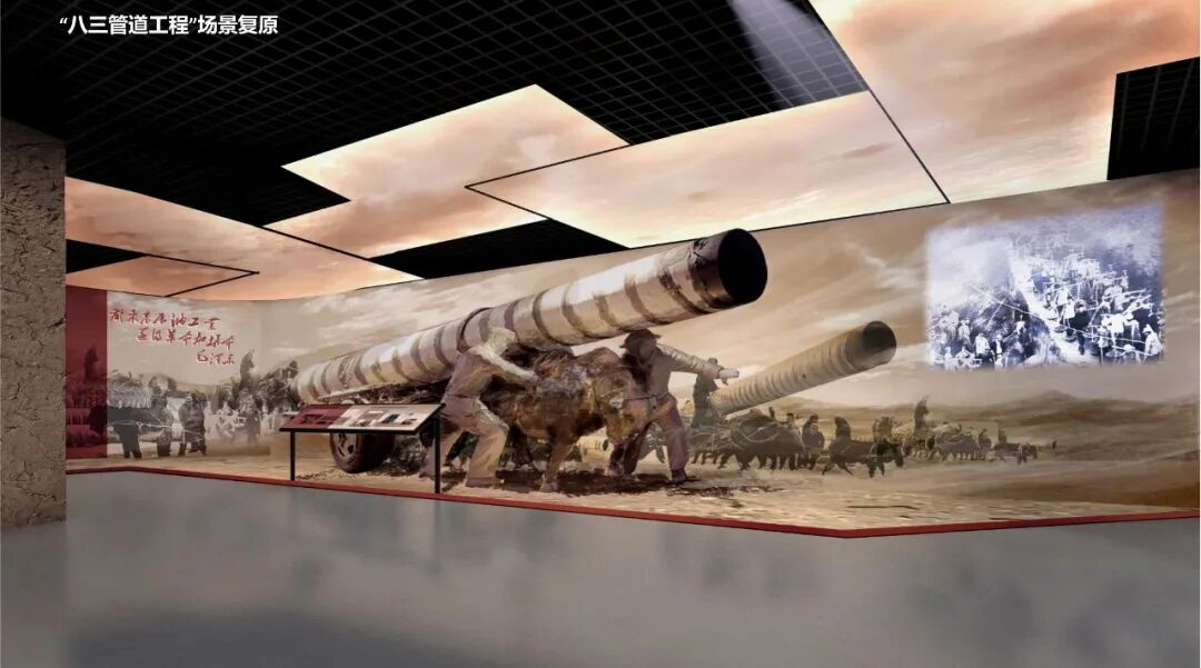 八三管道工程牛车运管场景打造沉浸式半景画,顶部动感灯箱结合墙面场景渲染艰苦奋斗的氛围,牛及人物变更为仿铜质感,结合历史影像,将八三精神植入人心。