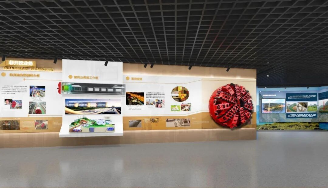 非开挖技术展区设置了盾构模型、沙盘及定向钻对接沙盘,其中在定向钻对接沙盘部分,设计为内嵌沙盘,充分利用空间,同时保证展区开阔。