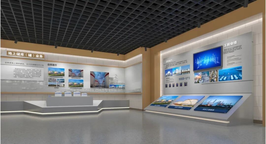 地上储库(罐)业务展区特色鲜明的储罐元素、结构丰富的展墙设计突出地上出库及LNG等存储装备的实施能力。