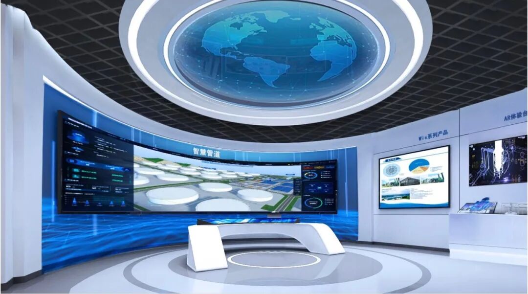 智慧管道业务展区图文影像结合实物,全面展示3i模式管道智慧化建设,设置AR、隔空互动飞屏等,重点展示大数据智能平台。