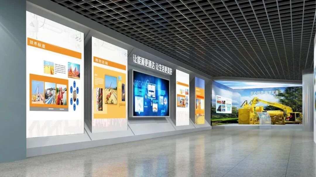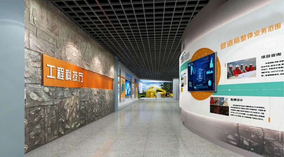 进入工程科技厅,脚印墙见证了管道人遍布世界的足迹,互动触摸屏展示管道局8项主营业务,图文灯箱结合屏幕展示管道局规划设计及科研能力。