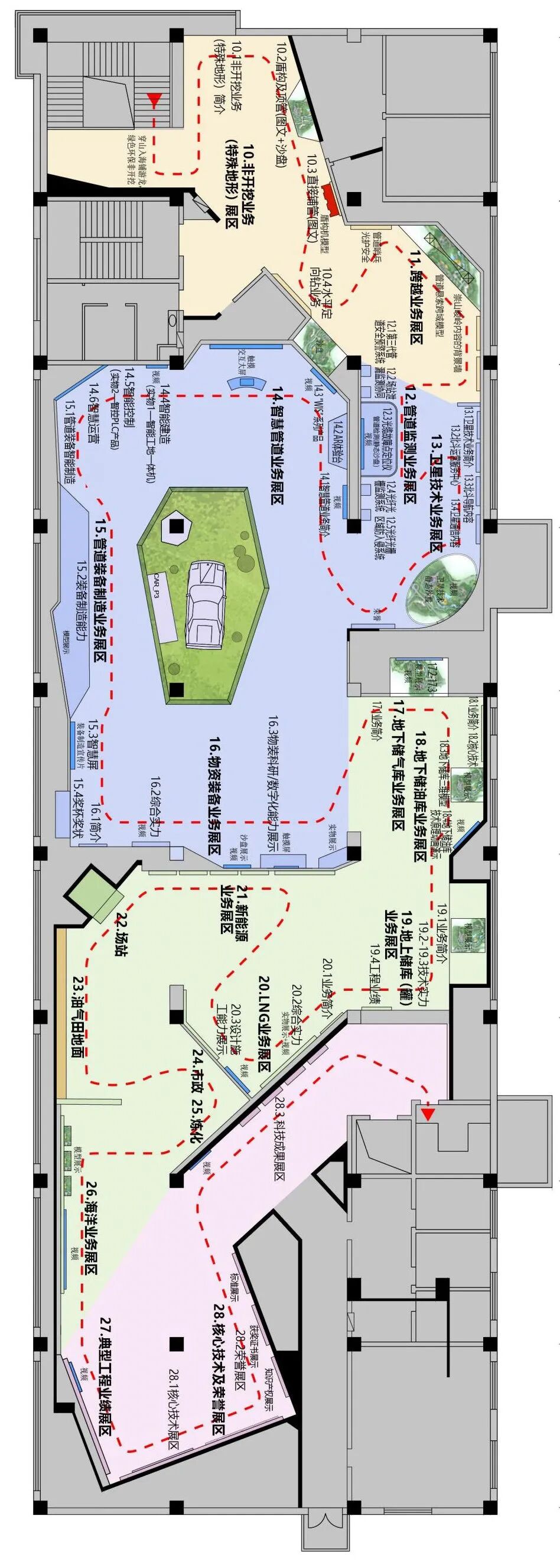 我们将原时光隧道拆除,分别展示跨越业务、管道监测业务及卫星技术业务。悬索桥位置前移,与跨越业务统一展示,在ING业务区域增设一面展墙,使流线更为合理顺畅。