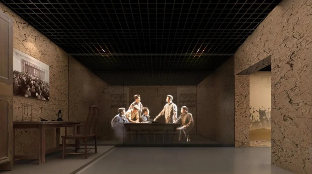 左侧历史物件还原指挥部内部场景,空间内设置悬浮影像再现当时会议场景,让观众身临其境,走进历史。