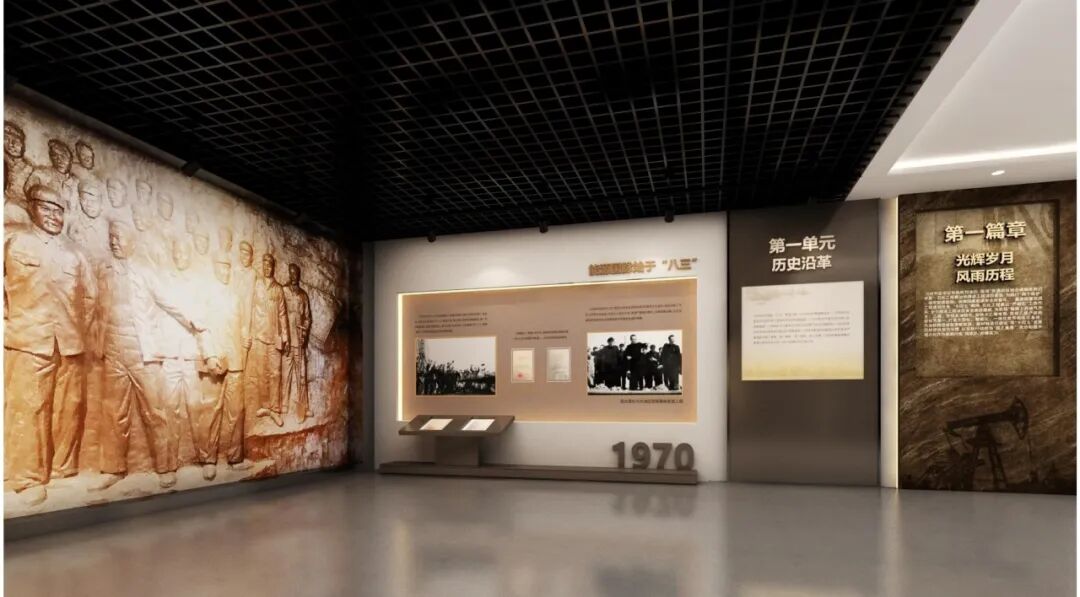 能源国脉始于“八三”保留原有浮雕墙,结合图文展板展示周总理视察大庆油田等历史事件。