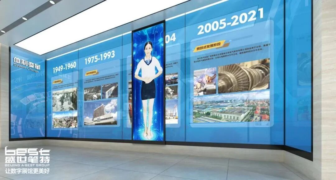 盛世笔特集团创新设计了“体制变革”展区,突破传统展墙设计。以时间轴线为基础,呈现一场穿越时空的哈汽历程之旅。参观者随脚步前行,互动滑轨屏相应介绍扩建续建、技术改造、股份制改造、跨跃式发展等四个阶段的重大事件。这一设计通过时序展示,生动呈现哈汽公司在不同历史时期的关键发展节点,为观众提供了沉浸式的体验。互动滑轨屏的运用使参观更加生动有趣,让观众在了解企业演进的同时,感受到哈汽公司在体制变革过程中的不懈努力和取得的重大成就。整个展区以其独特的设计手法,将哈汽公司的发展历程呈现得生动而引人入胜。