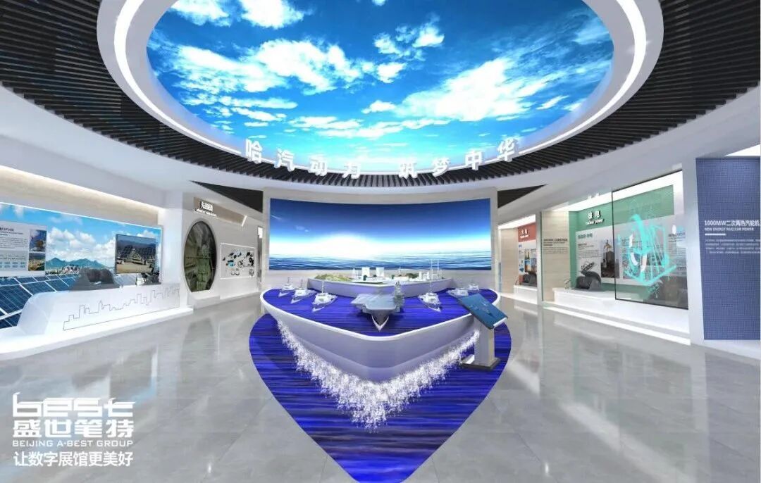 盛世笔特集团打造了“哈汽动力 筑梦中华”核心互动场景,以抽象的军舰元素为艺术造型,构建产业集群沙盘展台。参观者在操作台上点击“核电产业”界面,船型沙盘处核电厂灯光亮起,大屏播放核电产业的发展及贡献。展示区蓝天白云、波涛汹涌的海面,象征哈汽公司乘风破浪,打造装备制造业动力航母的宏伟蓝图。通过互动体验,参观者深入了解三大产业的运用领域,大屏概述产业特点及重要贡献。这一设计巧妙融合军舰艺术、互动科技和视觉效果,为观众呈现了一个富有创意和感官冲击力的展示场景,让他们沉浸在哈汽公司产业发展的激动人心的故事中。