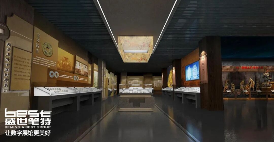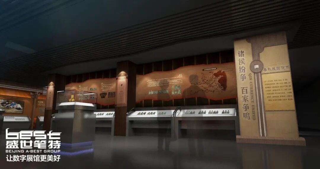 盛世笔特集团致力于中国钱币博物馆改造设计,独创性地运用春秋战国时期书写竹简作为墙面装饰,展示千年历史的独特韵味。设计巧妙结合展示手段,通过分布图生动呈现钱币出土地理位置,使观众更直观地了解历史脉络。这一设计巧思不仅突显历史时代背景,更通过地理图表展示,呈现了钱币考古的丰富内涵,为观众提供了深入了解的机会。这样的设计理念旨在为博物馆创造独特而富有启发性的展示体验,激发观众对钱币文化的浓厚兴趣。