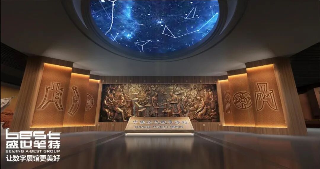 盛世笔特集团倾心打造中国钱币博物馆,传承千年文化。序厅保留原浮雕墙,两侧绢纱幕布印有历代钱币造型,勾勒悠久历史长河。吊顶创意融合灯带与软膜灯箱,流星汇聚、宇宙图像延伸,象征人类智慧之进取。设计彰显斗转星移、天工开物理念,呈现钱币文化之盛世。