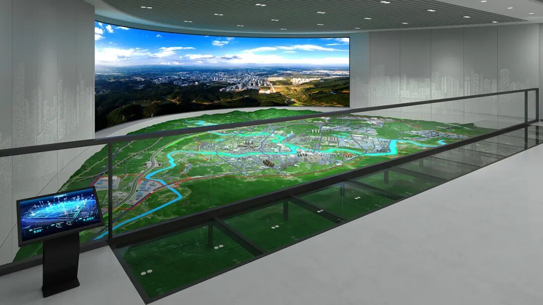 充分利用馆内空间结构,打造巨型沙盘展示系统,巨幅的弧形屏幕结合下沉式实景城市沙盘,就此打开独属于宁化的千里江山图。群峰叠嶂,道路交错,万家灯火,静与动完美结合,是宁化历史的回顾、当下的记录和未来的蓝图。