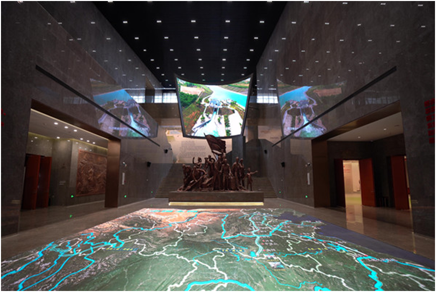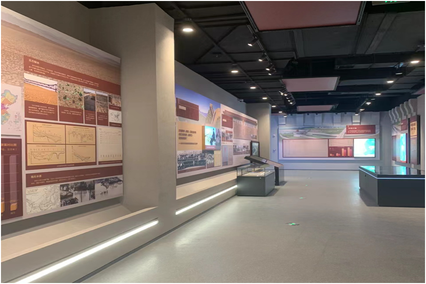 南水北调展览馆建筑面积6978平米,建筑结构为地上三层,挑高18米,单层建筑面积2300平米,层高6米。接待大厅三层贯通,展陈空间分列大厅两侧,有步行梯及空中连廊作为主要交通设施。针对这个展览空间,设计师们在布展思路中决定融合现代科技,着力打造以主题雕塑为核心的序厅区域,全面展示南水北调建设的整个发展历程,坚持用史料及故事说话,深入挖掘南水北调工程的珍贵历史照片、文献、档案、影像、实物。在布展形式方面,则注重创新展览方式和手段,着力利用最新科技成果,增强展览的吸引力,增加展览的参与性和互动性,适当增加雕塑、油画等艺术品营造崇高的精神氛围,生动再现南水北调这项伟大的世纪工程。
