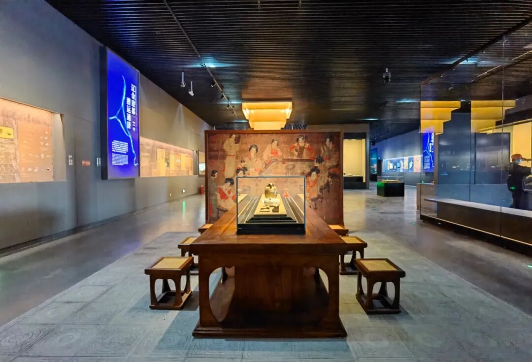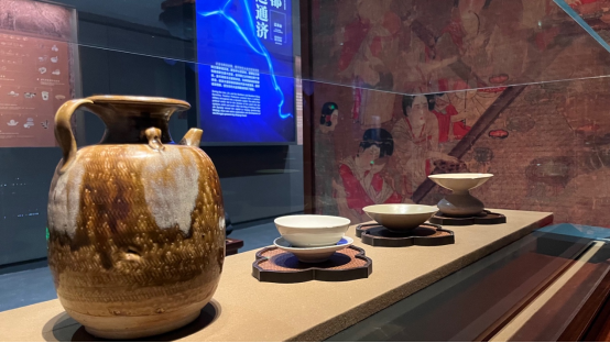 唐代煮茶场景以开放式布景的手法,搭载半围合通透场景,展现黄道窑执壶、越窑花盏等重点展品,步入式的小空间可供观者围坐近距离观赏文物。