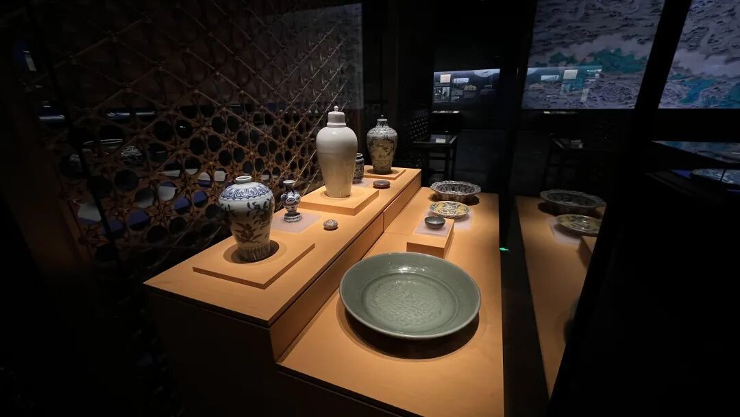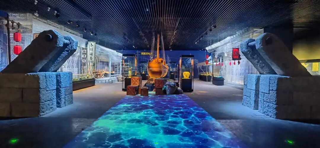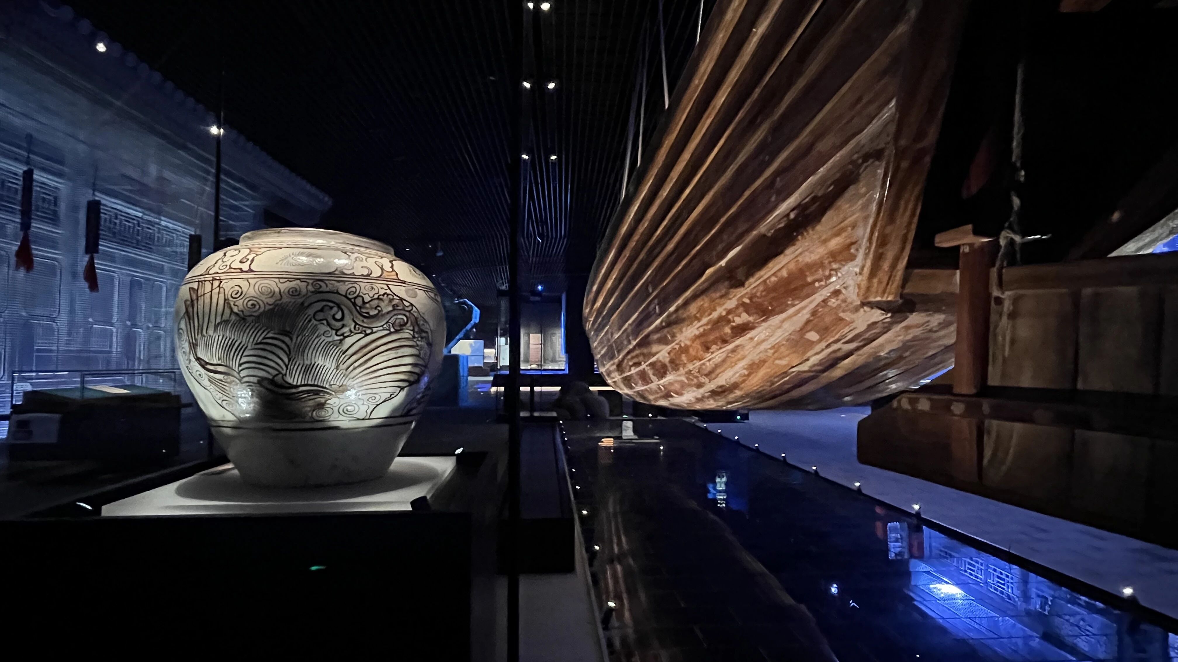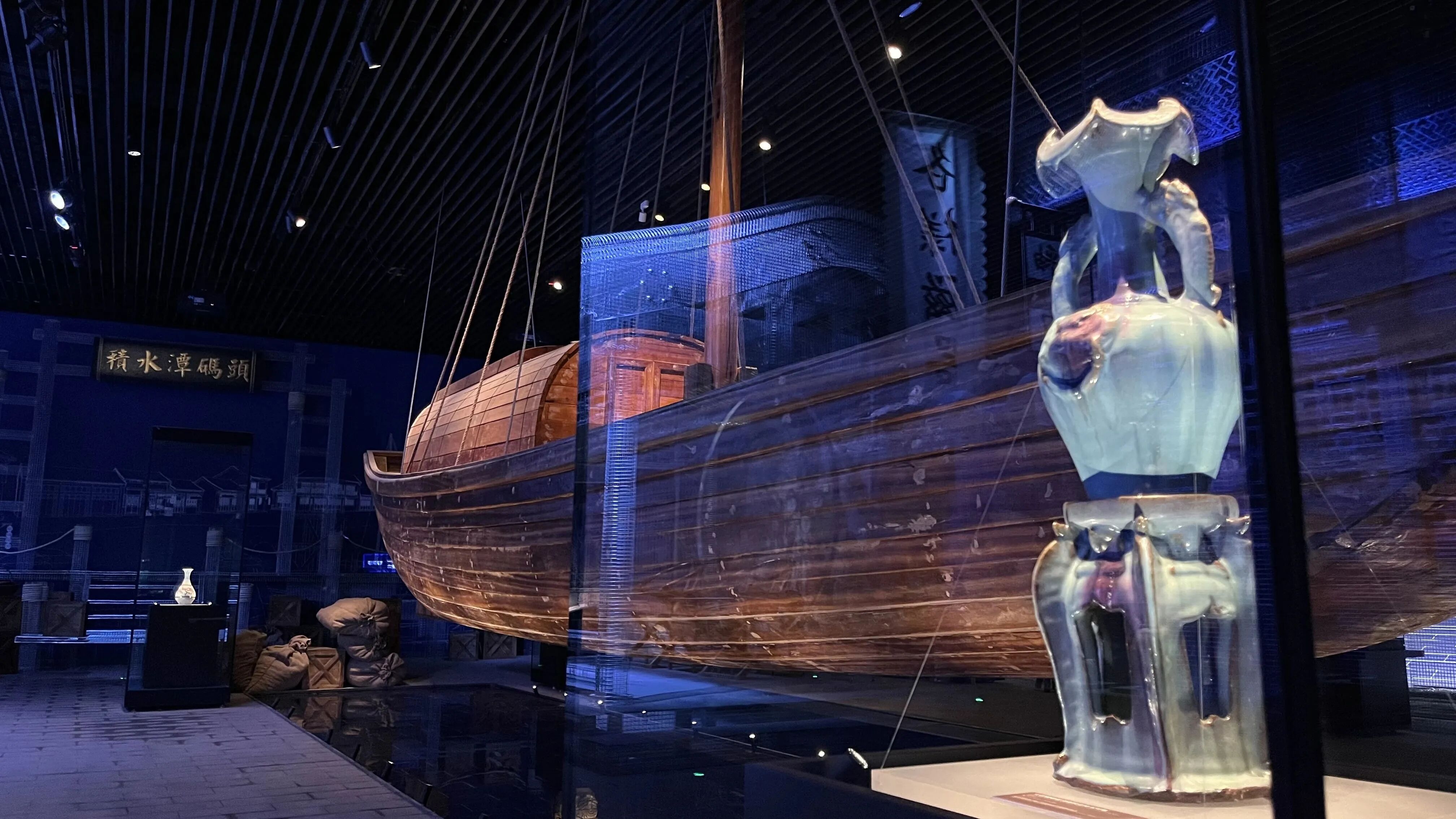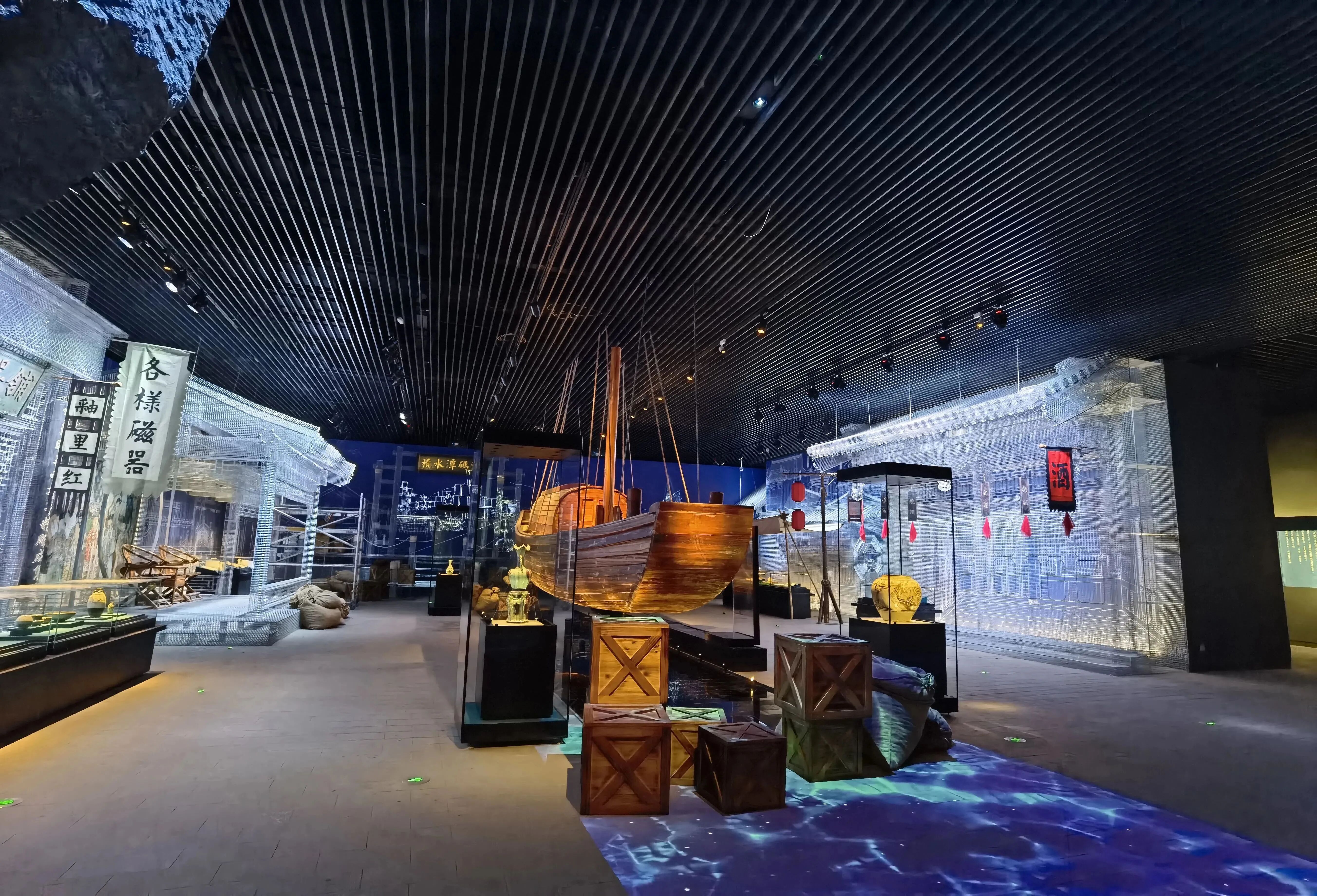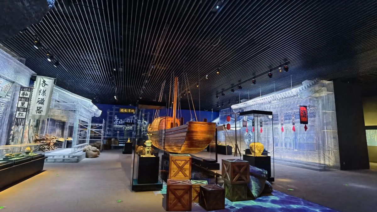 水光之上,代表帝国身份的元代沉船吊挂于空中,四周的出土文物,讲述运河成就北京成为政治与经济中心。