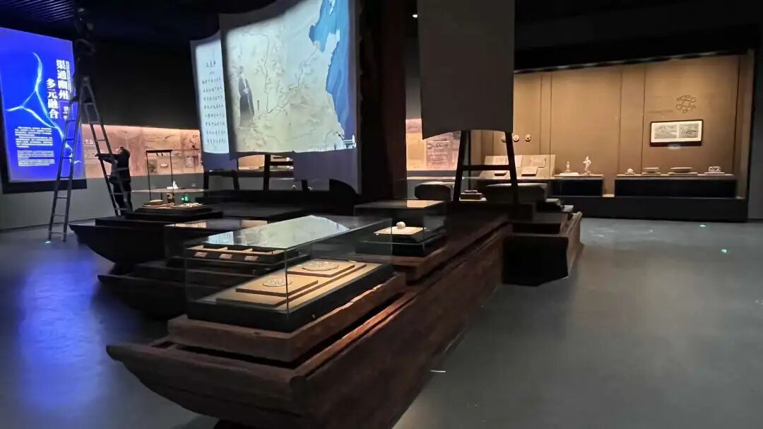 隋唐大运河的弧底船阵列融合文物陈列,展现了隋唐大运河多样化的物资贸易。航运语言延伸至展柜中,文物被亚克力展托承载漂浮于历史运河之上。