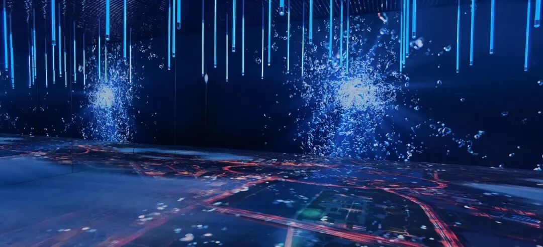 设计中,运用水的流动视觉符号和智慧化手段,赋予空间“流动、贯通、汇聚”的生命感,动态展示历史洪流中运河的产生、演变、发展与未来,展示“水”与“城”的之间相互呼应与联系;以艺术与技术赋能,衔接场景、空间、新媒体,凝练成“元、域、场”,塑造主题化的人文意境;以具身认知赋情,融汇重点内容形成组团生长,结合人流动线、展览区域、观众驻足点,绘制空间“心理地图”。创新理念下实现空间、展览和观众的融汇一体。多样化展示手段、创新型材质和工艺的合理化应用,使博物馆空间成为体感集合地、具身认知的感应场,构建起运河与城市浑然一体的生长关系,书写史诗般浪漫且生机磅礴的运河华章。