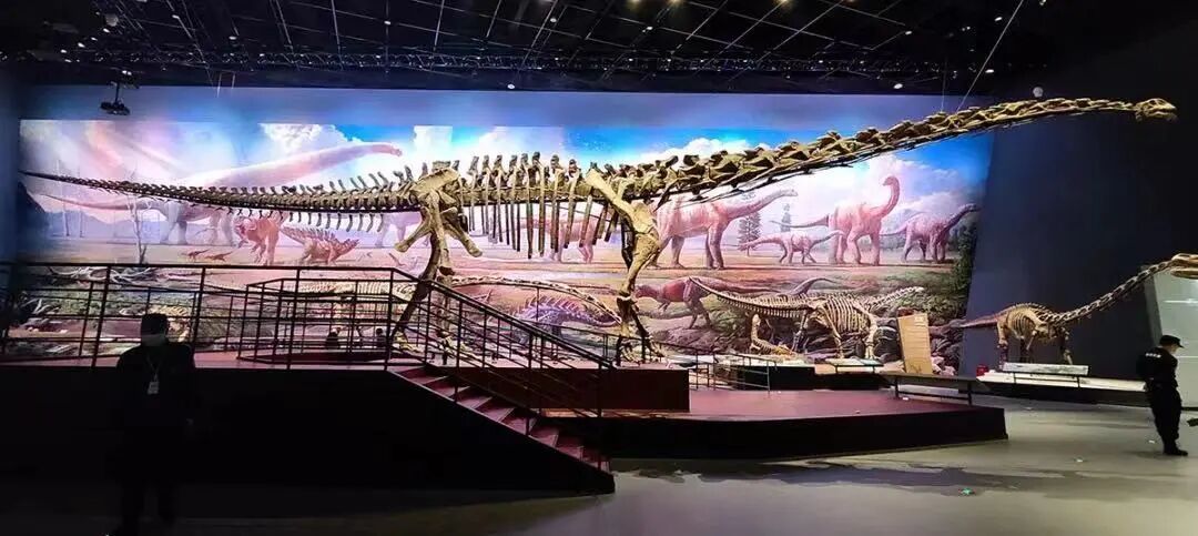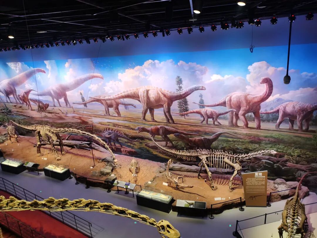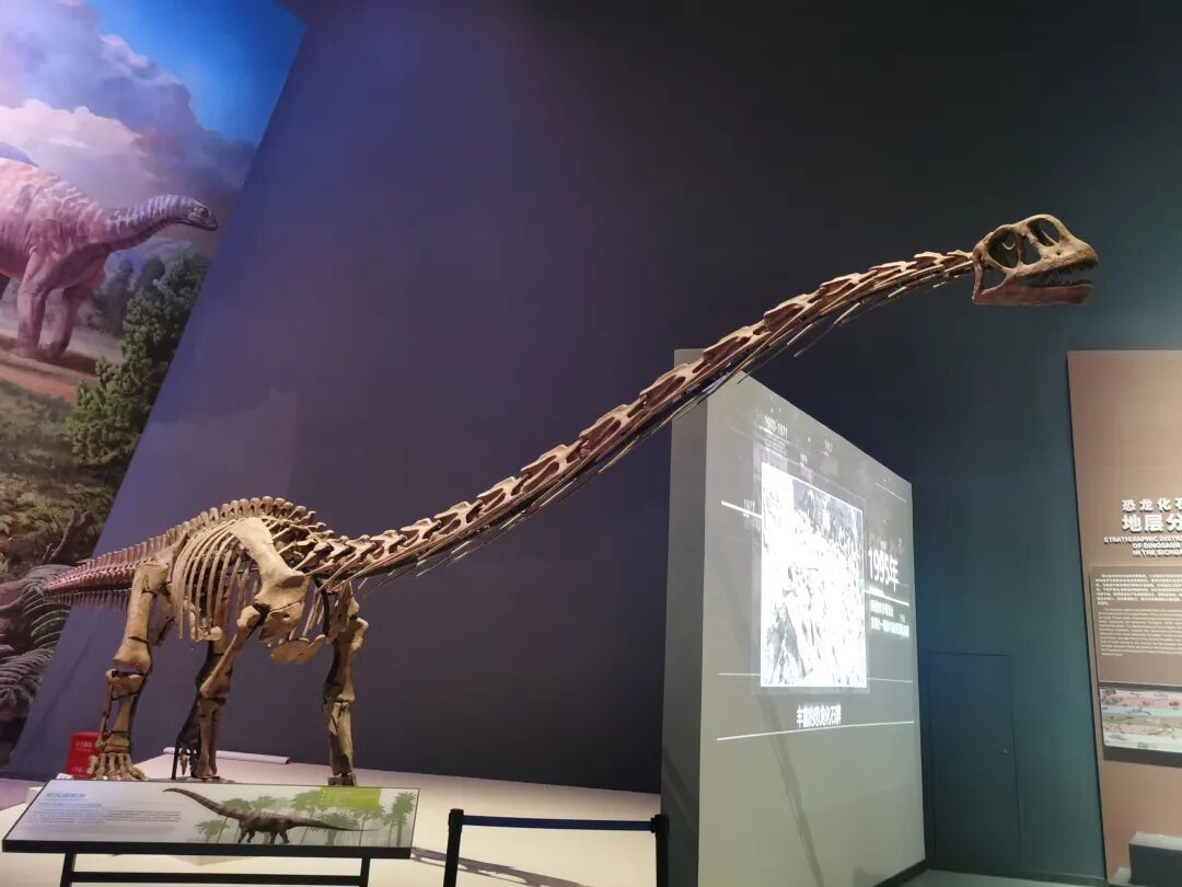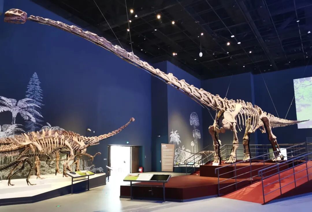 展厅中的大山铺恐龙动物群巨幅复原壁画及矩阵式恐龙骨架标本陈列,与红色岩石色调的中央展台相结合,衬托出镇馆之宝——合川马门溪龙骨架标本。它矗立在展厅中央格外显眼,是亚洲完整恐龙化石中的最大者。