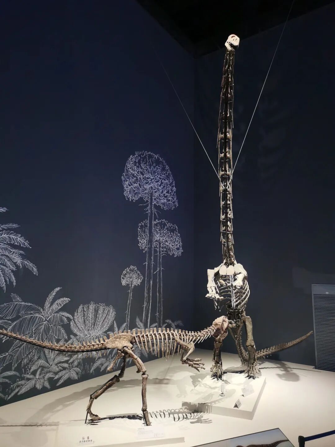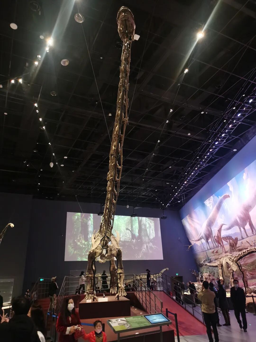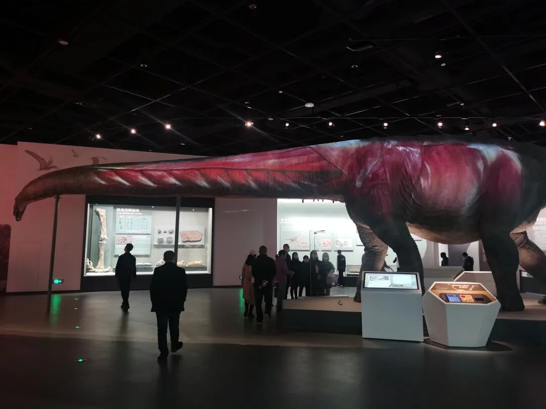 展厅中的大山铺恐龙动物群巨幅复原壁画及矩阵式恐龙骨架标本陈列,与红色岩石色调的中央展台相结合,衬托出镇馆之宝——合川马门溪龙骨架标本。它矗立在展厅中央格外显眼,是亚洲完整恐龙化石中的最大者。