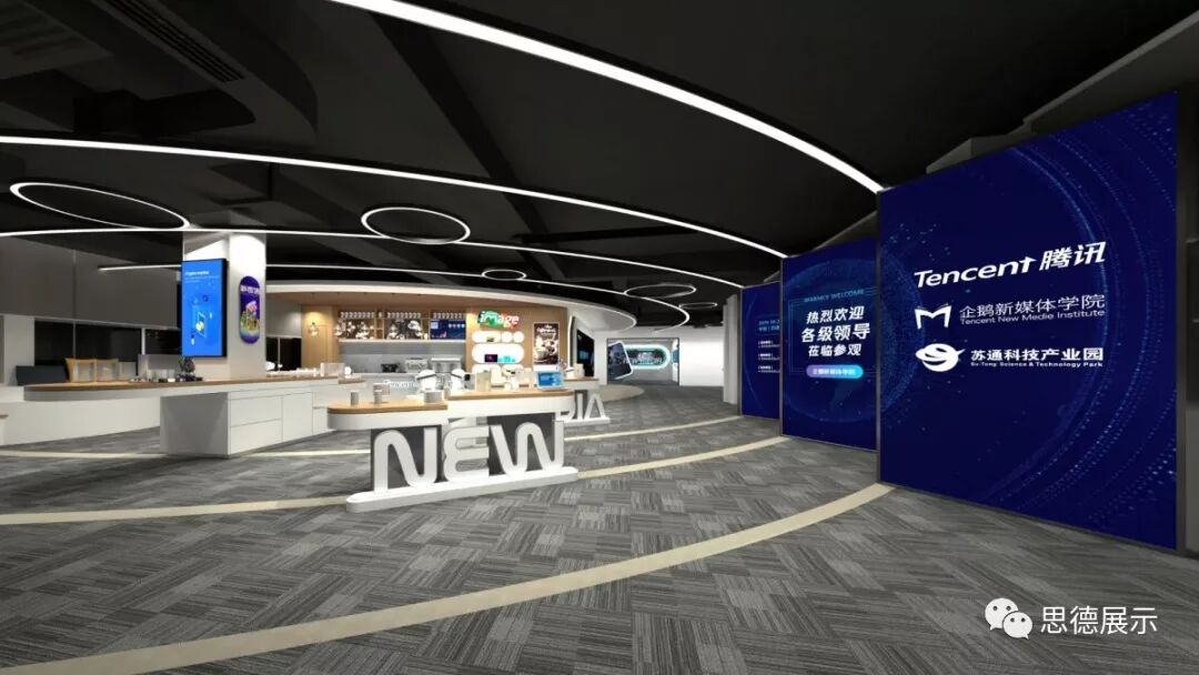 思德设计团队以南通新媒体产业链的驱动器、腾讯开放生态内容的南通融点为目标定位,将腾讯企鹅新媒体学院打造成集合展、学、用、研的数字化、智能化、专业化新媒体生态空间。