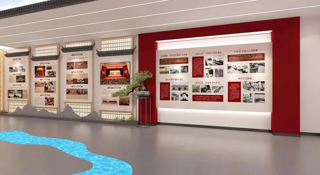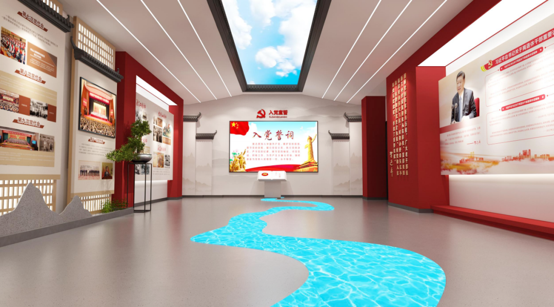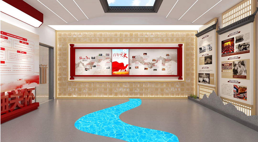 展厅设计包括序厅、党建文化走廊、党建文化展厅三个部分组成。我公司负责资料收集、整理提炼、大纲深化、方案策划、布展设计施工、多媒体展项硬、软件制作与安装调试、技术培训等一系列布展工程。