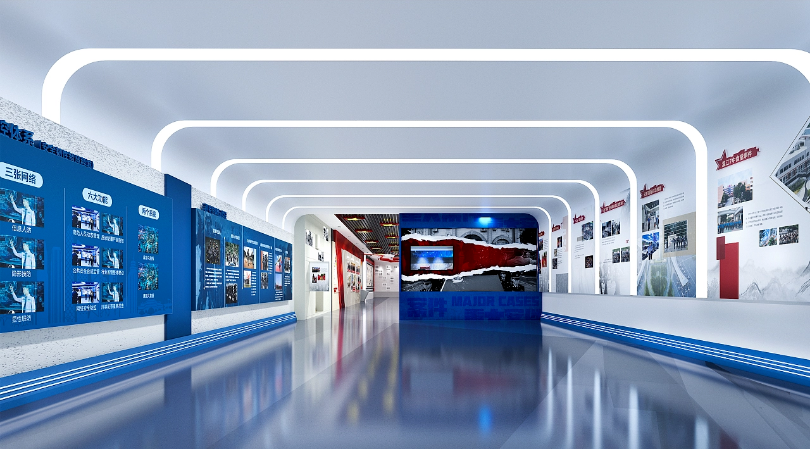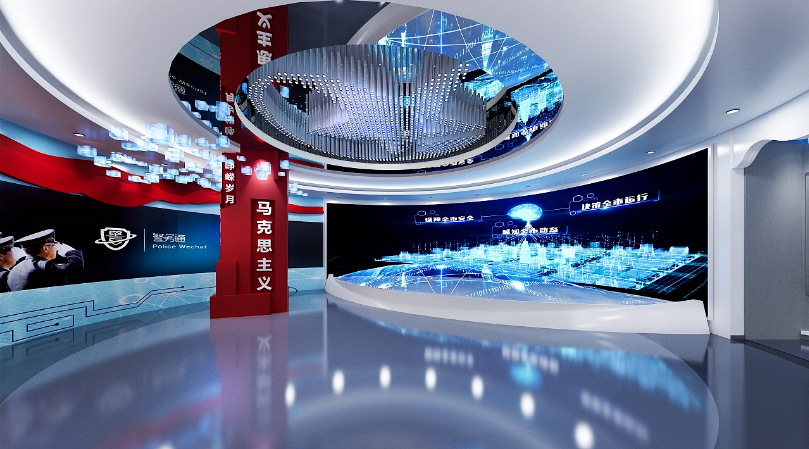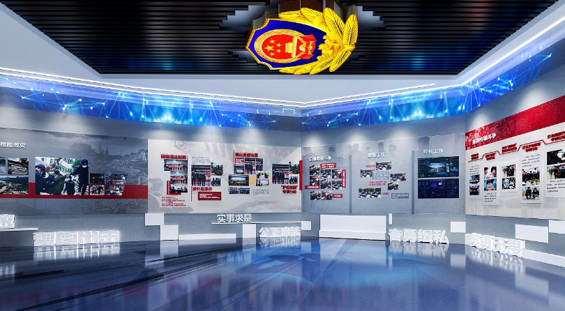 整体以蓝色为主色调,现代感、科技感十足。设计突出“小而精”的特色,重在对精神内核的挖掘及突出,充分利用“声、光、影”等元素,通过展览语言六位一体,达到一馆一世界,一展一文化,一处一特色, 一步一惊喜,呈现出丰富的警营文化。